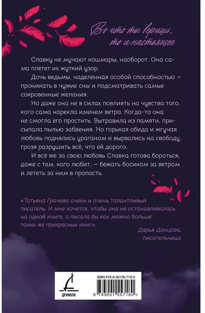 💳 Оплатить за товар можно при получении 🇰🇿 Есть бесплатная доставка по Казахстану от 1 дня 🎁 Копите бонусы с каждой покупки Серия: Дримбук. Проза Славку не мучают кошмары, наоборот. Она сама плетет их жуткий узор. Дочь ведьмы, наделенная особой способностью — проникать в чужие сны и подсматривать самые сокровенные желания. Но даже она не в силах повлиять на чувства того, кого сама нарекла именем ветра. Когда-то она не смогла его простить. Вытравила из памяти, присыпала пылью забвения. Но горькая обида и жгучая любовь поднялись ураганом и вырвались на свободу, грозя разрушить всё, что ей дорого. И всё же за свою любовь Славка готова бороться, даже с тем, кого любит, — бежать босиком за ветром и лететь за ним в пропасть. Не можешь лететь — падай. |