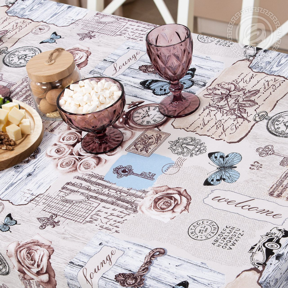 Новый рисунок на рогожке под названием «Либретто» насыщен и разнообразен в своем содержании: здесь можно увидеть деревянные двери со старинными ручками, отрывки из писем с рисунками, часы, букеты роз или единичные розочки, ключики и бабочки. Причем если в основном цвет всего изображения является бледно-розовым, то некоторые элементы окрашены в нежно-голубой цвет. Такое сочетание дополняет друг друга, принося некоторый акцент одного цвета на другой. Ткань выполнена качественно, а рисунок добавляет эстетической красоты и уникальности.