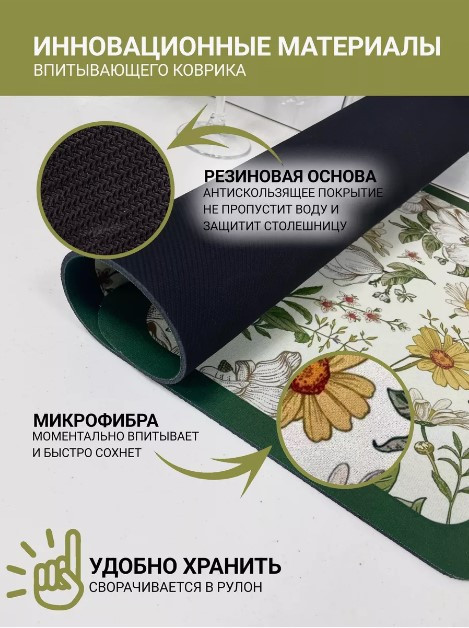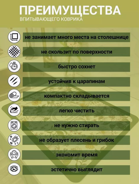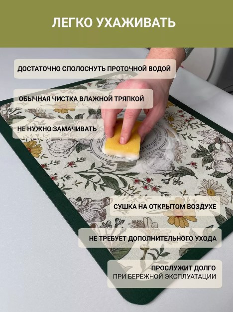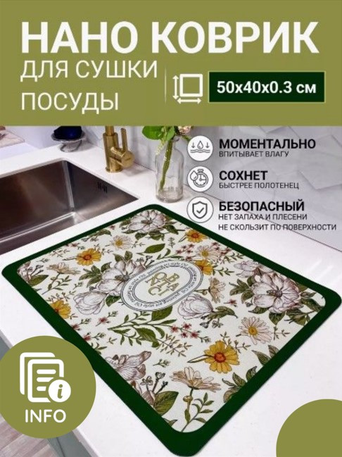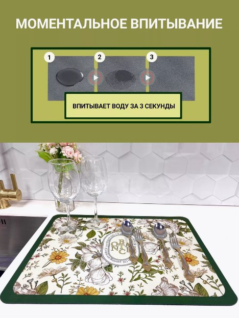 Коврик для сушки посудыВ данный момент этот товар отсутствует в продаже. Возможно, у нас найдется аналогичный или похожий товар здесь. Универсальный влагопоглощающий и быстросохнущий нескользящий диатомитовый нано-коврик станет Вам незаменимым помощником. С ним Вы легко наведете порядок в доме: на кухне, в ванной, прихожей, детской и при кормлении животных. Он подходит для сушки как столовых приборов и различной кухонной утвари после мойки, так же овощей и фруктов или разморозки еды. |