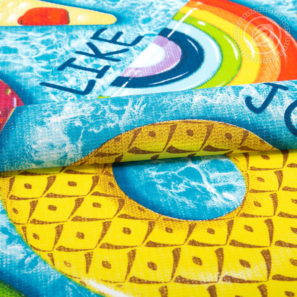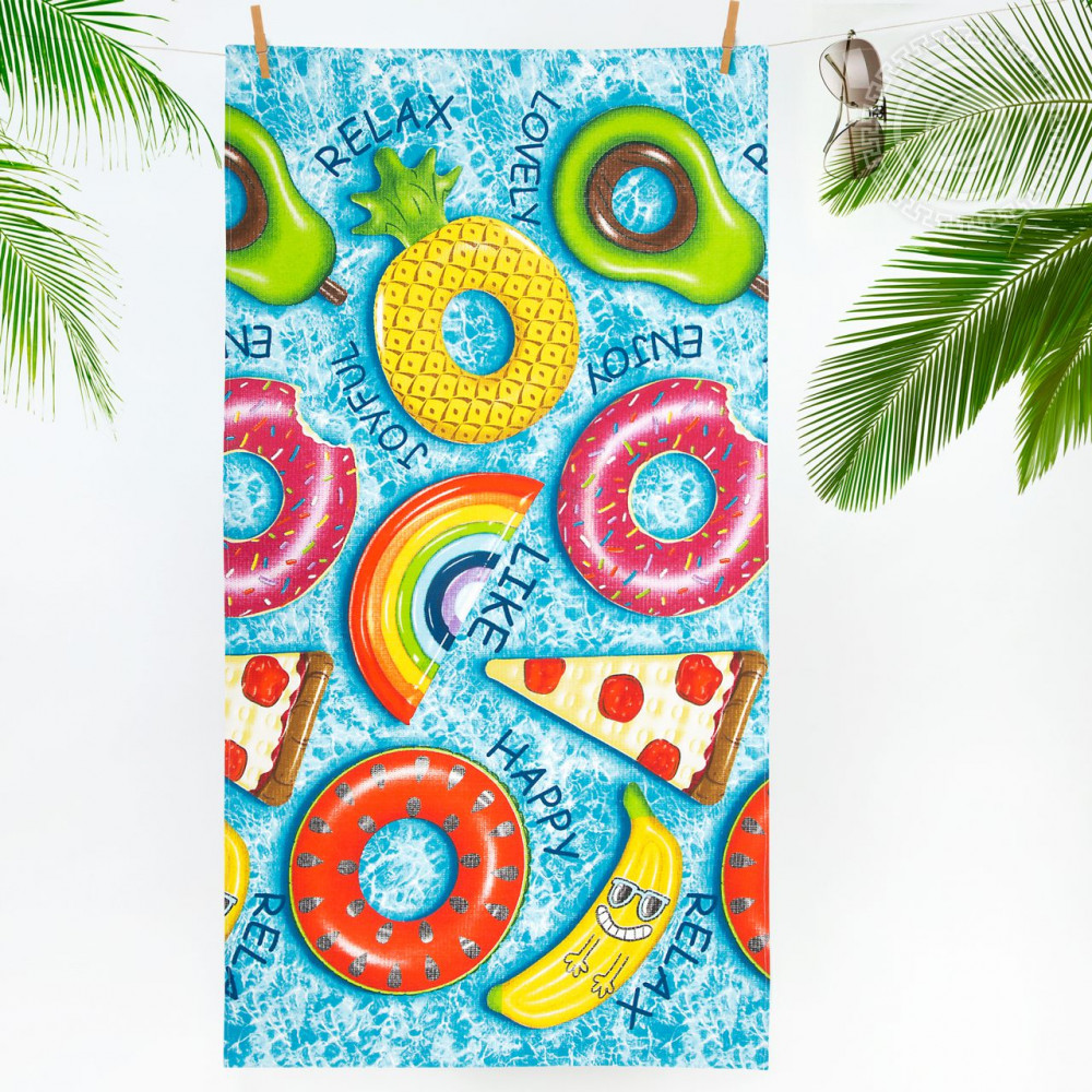Что такое авторский дизайн вафельного полотна «Релакс»? Это компания из модных донатсов, кусочков пиццы, стильных авокадо, ананасов и бананов. Они веселятся на фоне водной лазури. И от них так и веет счастьем и релаксом. Именно поэтому вафельное полотенце «Релакс» — отличный вариант для отдыхающих.