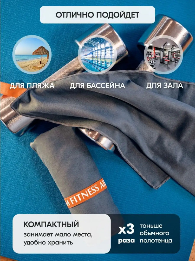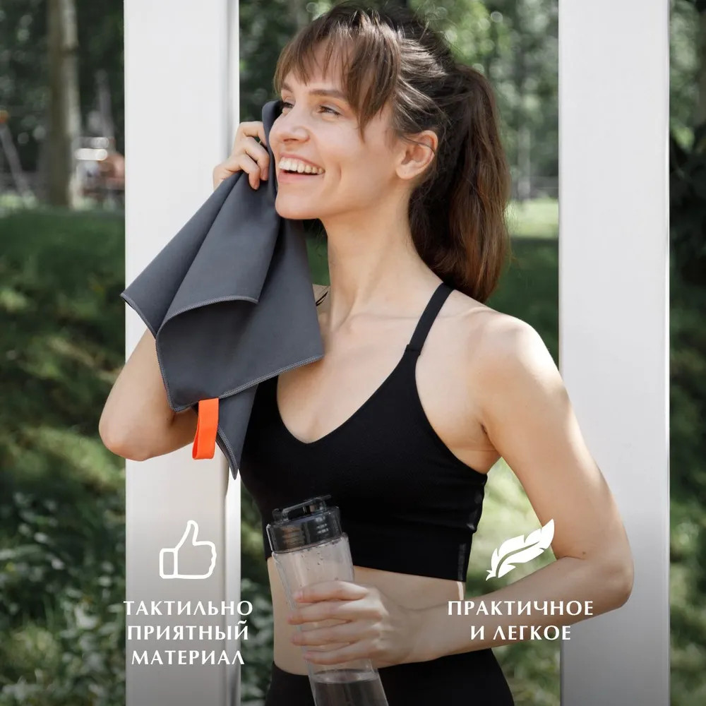 Спортивное полотенце из микрофибры незаменимо при занятиях спортом, хорошо впитывает влагу, моментально высыхает, благодаря технологии Airdrop и обладает более высокими абсорбирующими свойствами, в отличие от полотенец из льна и хлопка. Микрофибра — тонкий и быстросохнущий материал, гипоаллергенен, не несёт в себе разного рода вредные микрочастицы и бактерии. Полотенца из микрофибры, плотностью 200 гр.м2 впитывают в 6-7 раз больше своего веса, а сохнут в 3-4 раза быстрее, чем аналогичные банные полотенцам из других материалов. Буквально за 10-20 минут пока вы одеваетесь и собираете вещи оно станет совершенно сухим, особенно на солнце или в ветреный день. Полотенце из микрофибры обладает не только гигроскопичностью, но и гипоаллергенностью, а значит, у вас не возникнет нежелательных реакций. Полотенце удобно брать с собой, оно компактно складывается и удерживается, при помощи вшитой резинки, которая не потеряется. Еще один немаловажный отличительный параметр, весит такое полотенце в разы меньше, чем обычное махровое, бамбуковое, вафельное полотенце при сопоставимых размерах.