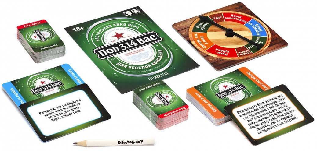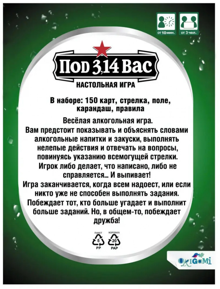 Origami Игра настольная «Под 3,14вас»В данный момент этот товар отсутствует в продаже. Возможно, у нас найдется аналогичный или похожий товар здесь. Серия: Настольная игра Под 3,14вас — весёлая алкогольная игра. Вам предстоит показывать и объяснять словами алкогольные напитки и закуски, выполнять нелепые действия и отвечать на вопросы, повинуясь указанию всемогущей стрелки. Игрок либо делает, что написано, либо не справляется... И выпивает! Игра заканчивается, когда всем надоест, или если никто уже не способен выполнять задания. Побеждает тот, кто больше угадает и выполнит больше заданий. Но, в общем-то, побеждает дружба! |