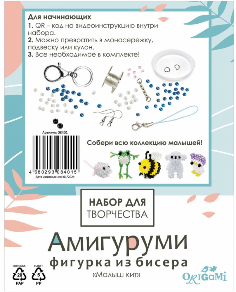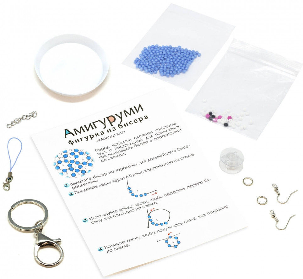 Origami Амигуруми из бисера «Малыш кит»В данный момент этот товар отсутствует в продаже. Возможно, у нас найдется аналогичный или похожий товар здесь. Серия: Амигуруми из бисера Набор для творчества «Амигуруми из бисера» — это уникальный комплект, предназначенный для создания оригинальных и красивых украшений в технике амигуруми. А также ссылку на пошаговую видео инструкцию, которая поможет вам создать уникальные изделия даже без опыта в рукоделии. Готовую фигурку можно превратить в красивые брелоки или яркие серьги которые станут украшением для вас или прекрасным подарком для друзей и близких. Материалы: леска изготовлена из нейлона; бисер (в пакетах с замком) и тарелочка — из полимерных материалов; подвески и колечки — из металла и текстильных материалов; инструкция — из бумаги. |