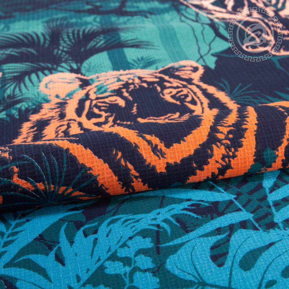 Контрастный рисунок украсил вафельные полотенца «Хантер» собственного производства. На темно-зеленом фоне в виде белых и оранжевых контуров изображены хозяева леса. Возникает ощущение, будто на джунгли опустились сумерки. И среди листвы выделяются лишь силуэты. «Хантер» — практичный и актуальный текстиль в подарок.