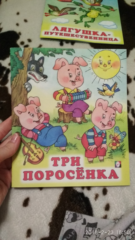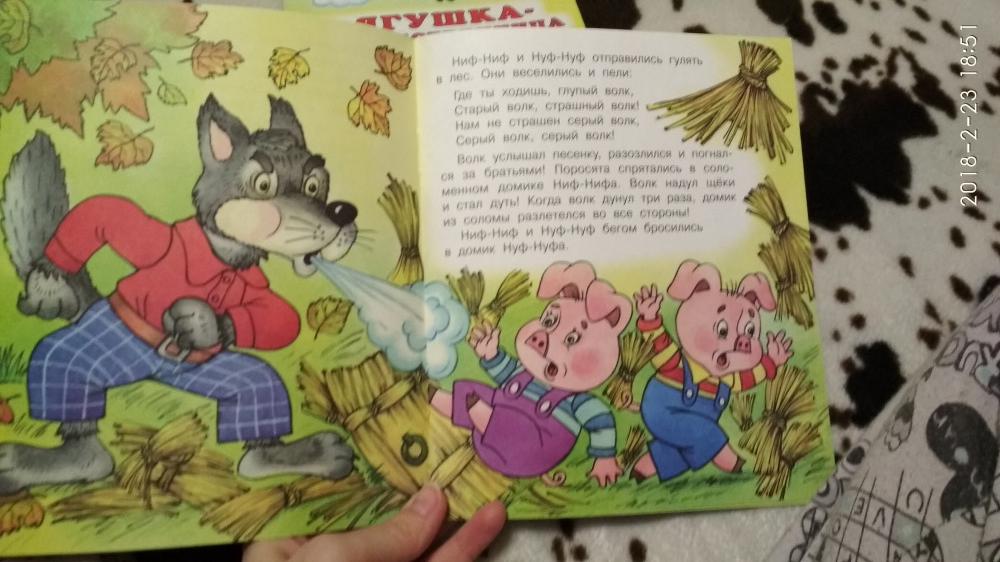 Ребенку 5 лет, очень понравилась книжка - не очень большая, но и не традиционная книжка-малышка. Листы из плотной бумаги, иллюстрации яркие, имена поросят, привычные нам с детства (Нуф-нуф), в отличие от многих других книжек о трёх поросят, где их зовут то Рики, то еще как-то. В общем, за такую цену приятный сюрприз)