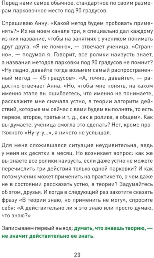 Сергей Моряхин написал замечательную книгу о том, как освоить любую теорию и перевести эти теоретические знания в практическую плоскость. Все четко и ясно, книга небольшая по объему, но очень полезная, по моему мнению. Считаю, что стоит купить. И не только тем, кто хочет овладеть наукой вождения, вообще всем.