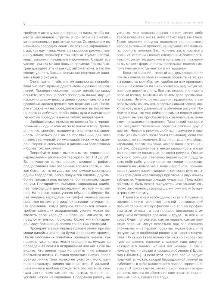 Рисунок по представлению в теории и упражнениях от геометрии к архитектуреАлексей Александрович Мусатов, Ольга Валерьевна Осмоловская В данный момент этот товар отсутствует в продаже. Возможно, у нас найдется аналогичный или похожий товар здесь. Книга станет прекрасным помощником в подготовке к вступительным экзаменам в архитектурные вузы. Материал представлен в основном практическими упражнениями, начиная от простейших (рисунок прямых и параллельных линий) и кончая сложными композициями из геометрических тел со врезками, а также рисунками архитектурных деталей. К каждому упражнению даются подробнейшие пояснения и рекомендации по выполнению. Очень много иллюстраций, которые могут освоить правильное построение фигур. |