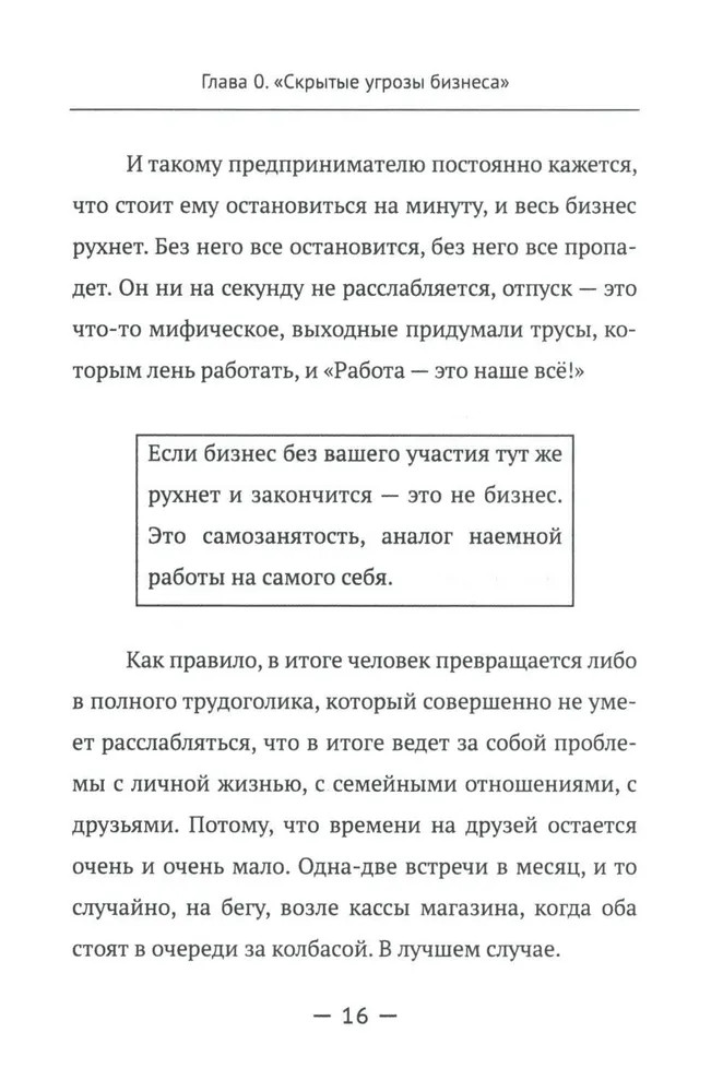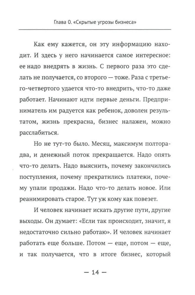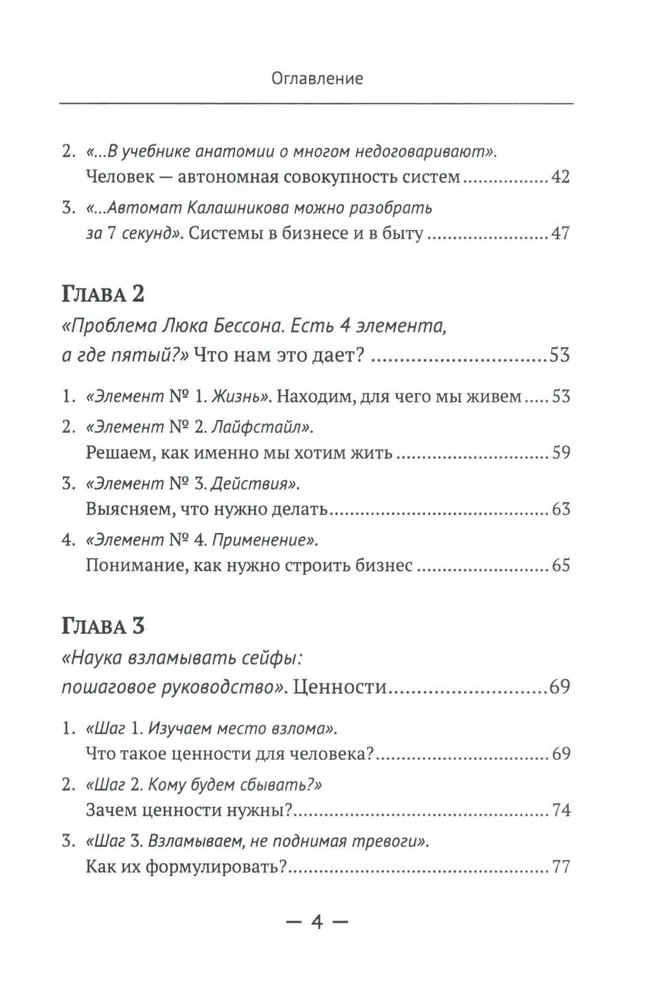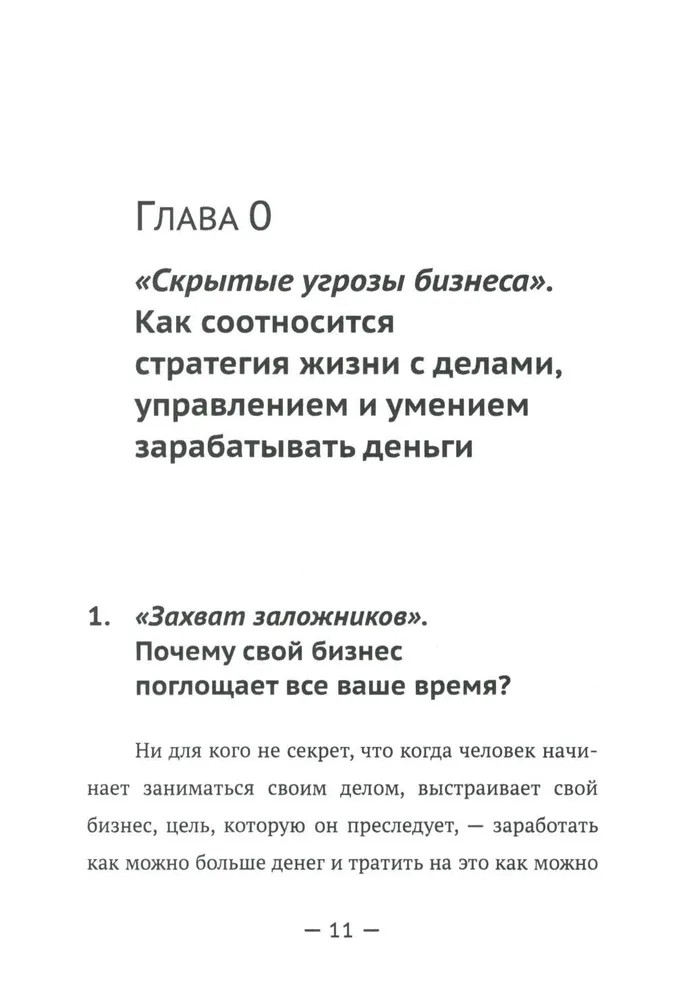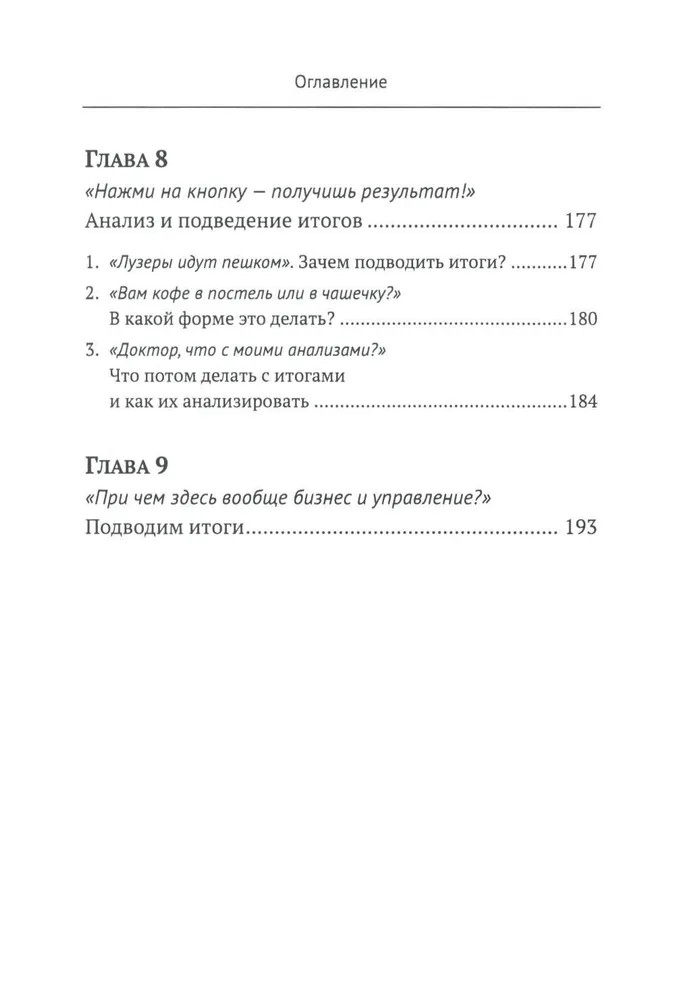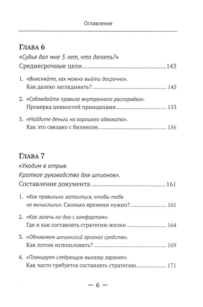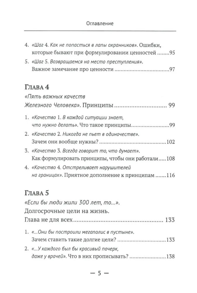 Вторая часть (главы 5-6) определяет различные горизонты планирования, знакомит читателя с понятиями «цели-ориентиры» и «области жизни». В целом она учит среднесрочному планированию на основе того, что действительно важно для человека в каждой из областей его жизни, при этом основываясь на предварительной работе, проделанной в первой части. Приводятся конкретные примеры по правильному и неправильному планированию. Третья часть (главы 7-9) служит для обобщения и практического применения материала. Особое внимание уделено технике формирования итогового документа и работе с ним. Разобраны варианты стратегий и методы их воплощения. Делается важный акцент на анализе как важнейшем элементе стратегии жизни, который по разным причинам обходится стороной в других подобных публикациях. Задается конкретный алгоритм и вектор дальнейшего развития человека. |