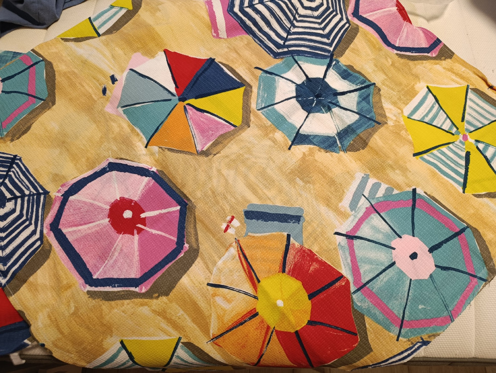 в реале зонтики крупные (не так, как на фото),поэтому на всё полотенце полтора зонтика (смотрится невзрачно), полотно вафельное