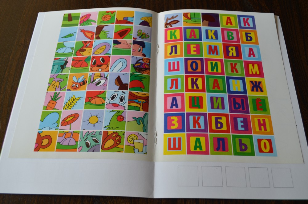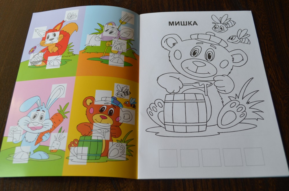 Отличная книжка-раскраска. Каждый рисунок на своей страничке - можно спокойно раскрашивать фломастерами и не бояться, что картинка будет просвечиваться. Обложка очень плотная, на ней 8 картинок с недостающими частями, которые ребенок должен подобрать.