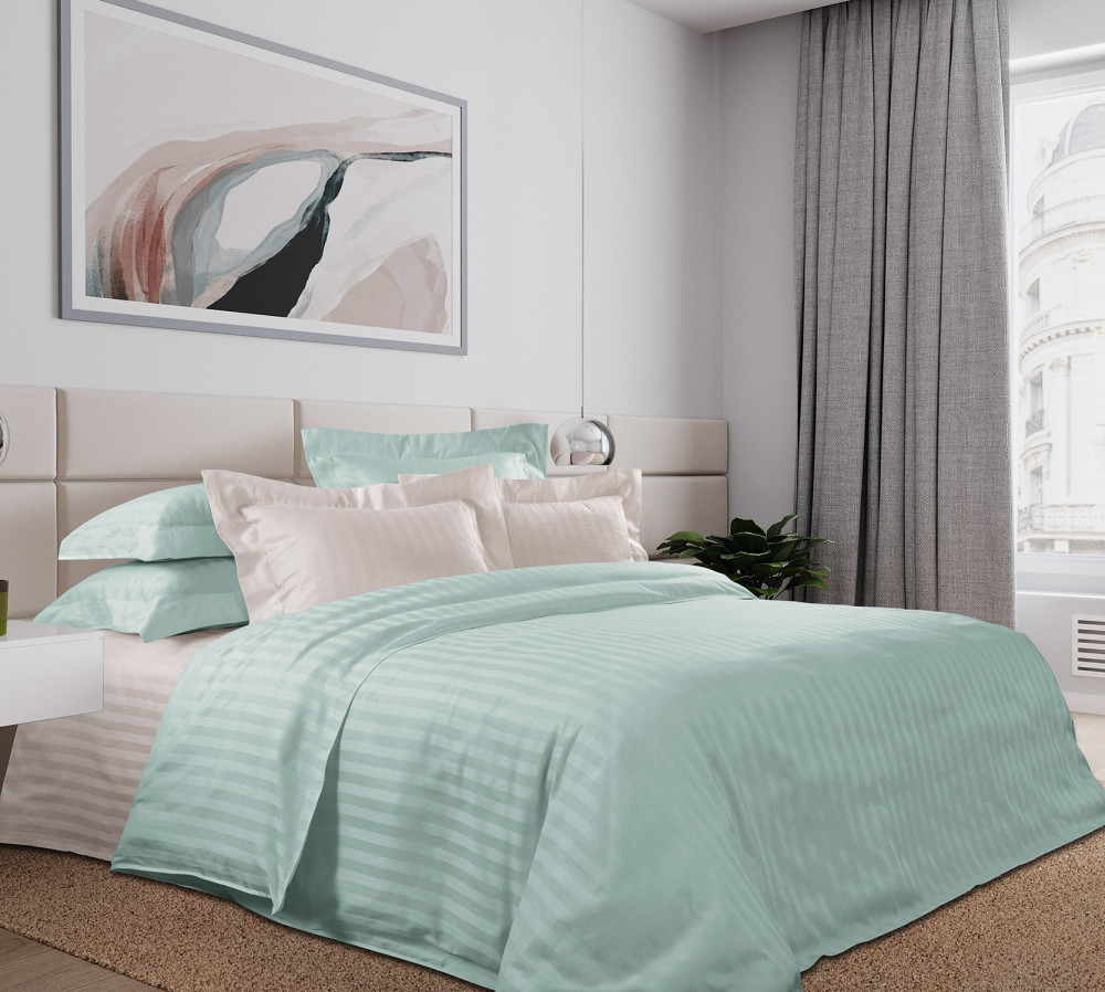 В данный момент этот товар отсутствует в продаже. Возможно, у нас найдется аналогичный или похожий товар здесь. Комплект постельного белья выполнен из 100% длинно-волокнистого пакистанского хлопка высшего качества, ткани страйп-сатин, довольно плотной (120 г/м) и прочной, износоустойчивой и очень красивой. Мягкость и блеск ее часто сравнивают с шелком. На поверхности можно рассмотреть чередующиеся глянцевые и матовые полоски, образованные благодаря особому способу переплетения нитей. Ширина контрастной полоски 2 см. Полосатый рисунок и дал название страйп-сатину, так как приставка «страйп» (stripe) переводится с английского как «полоска».