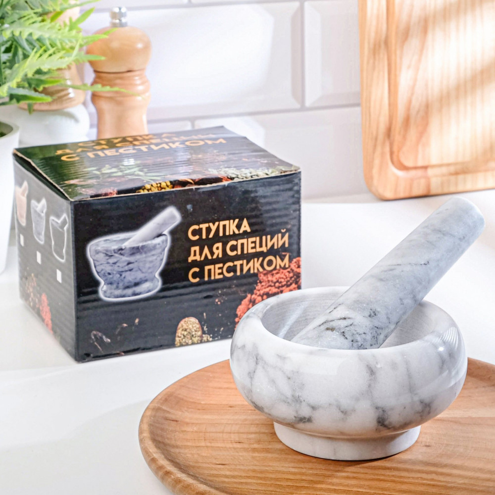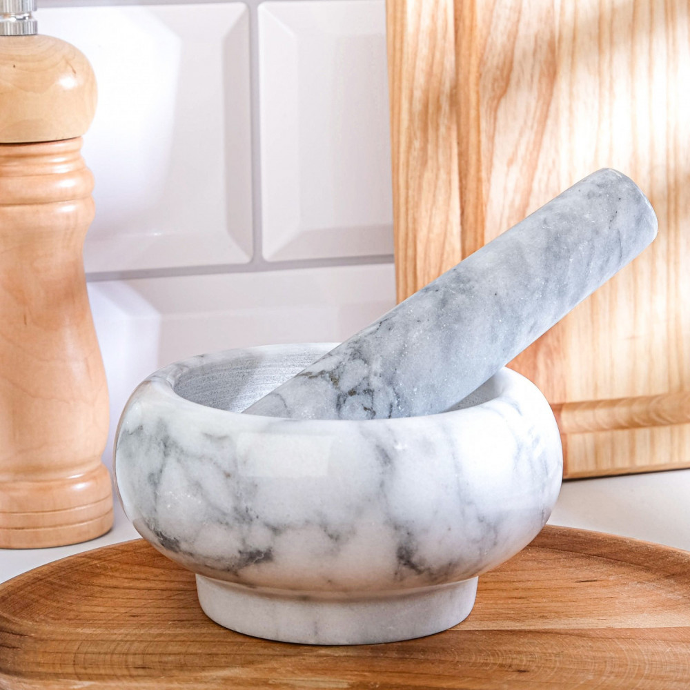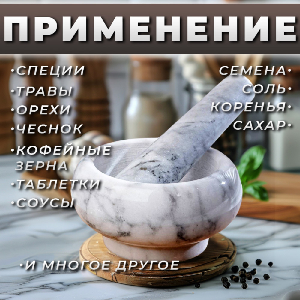 Ступка с пестиком — это универсальное кухонное приспособление, которое идеально подходит для измельчения, дробления и растирания специй, трав, зёрен, орехов, чеснока, таблеток, семян, соли и т. д. Каменные ступки очень прочные и выдерживают годы интенсивного использования. Камень не вступает в реакцию с кислотами и щелочами, поэтому вкусовые качества и ароматы ингредиентов не искажаются. Каменные ступки имеют слегка шероховатую поверхность, что позволяет измельчать и растирать специи, травы и другие ингредиенты до нужной консистенции. Из-за своего веса каменные ступки остаются на месте во время измельчения ингредиентов, обеспечивая удобство и безопасность использования.