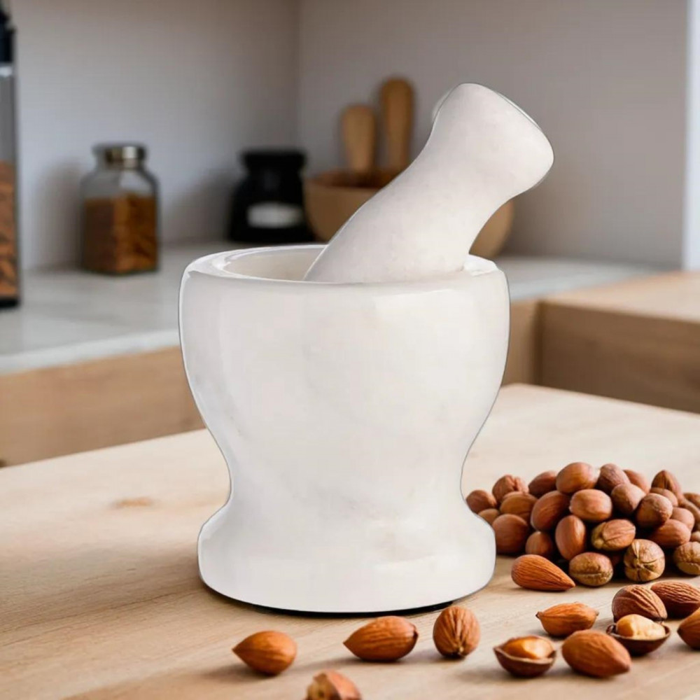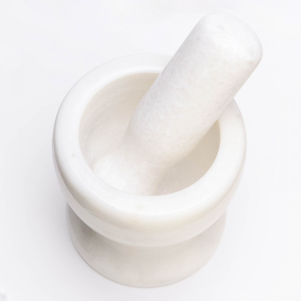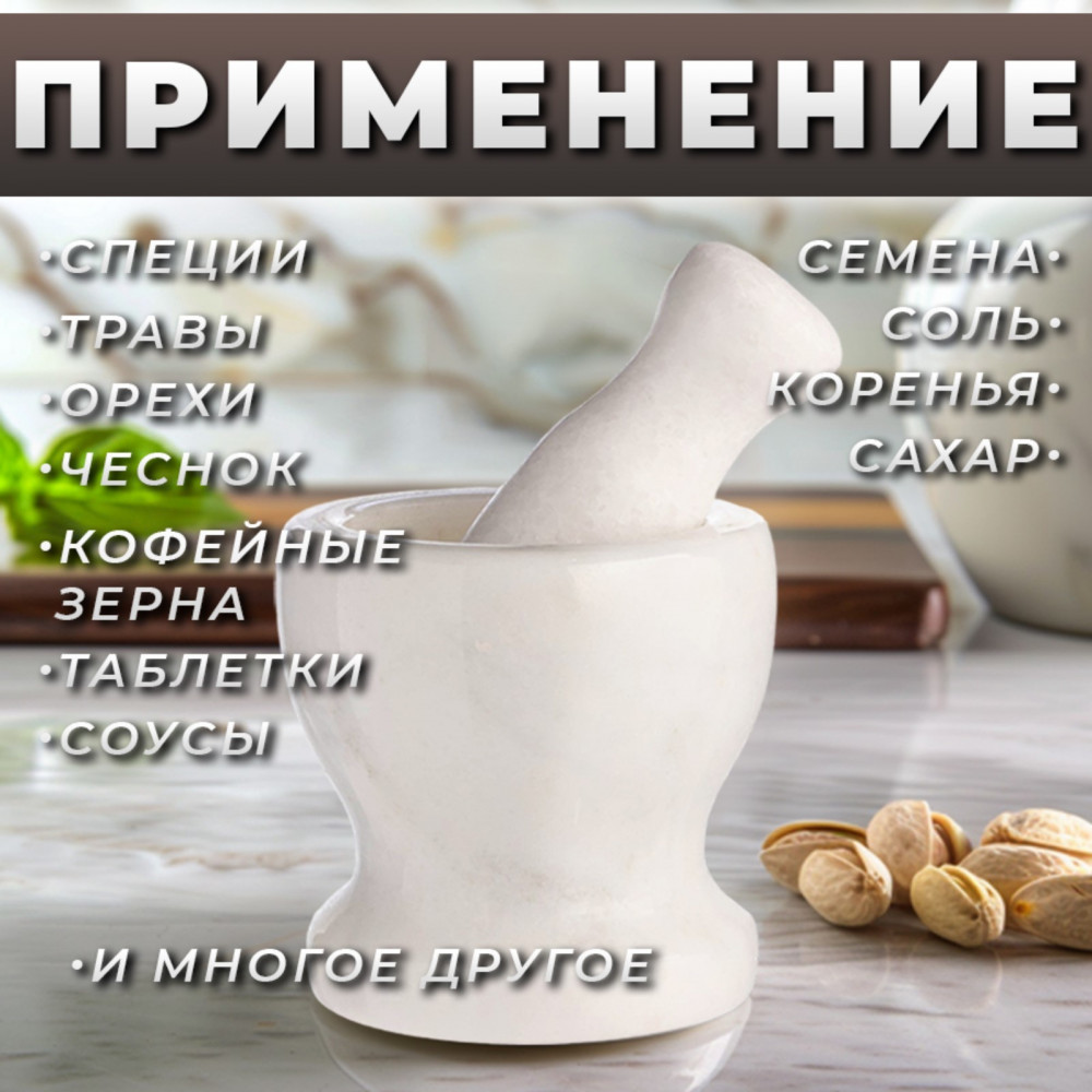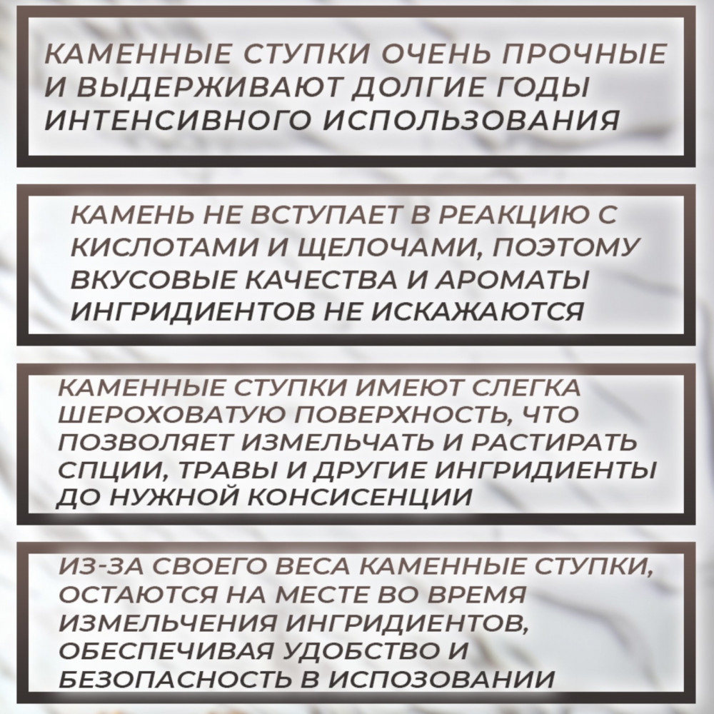 Ступка с пестиком — это универсальное кухонное приспособление, которое идеально подходит для измельчения, дробления и растирания специй, трав, зёрен, орехов, чеснока, таблеток, семян, соли и т. д. Каменные ступки очень прочные и выдерживают годы интенсивного использования. Камень не вступает в реакцию с кислотами и щелочами, поэтому вкусовые качества и ароматы ингредиентов не искажаются. Каменные ступки имеют слегка шероховатую поверхность, что позволяет измельчать и растирать специи, травы и другие ингредиенты до нужной консистенции. Из-за своего веса каменные ступки остаются на месте во время измельчения ингредиентов, обеспечивая удобство и безопасность использования.
