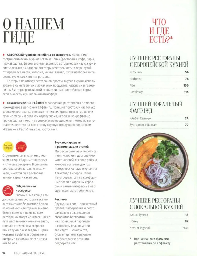 💳 Оплатить за товар можно при получении 🇰🇿 Есть бесплатная доставка по Казахстану от 1 дня 🎁 Копите бонусы с каждой покупки В авторском туристическом гиде по Республике Башкортостан из серии путеводителей «География на вкус» журналиста Ники Ганич собрано более 50 заведений и множество рецептов фирменных блюд от лучших поваров этого региона России. Наряду с ресторанами, кафе, гастромаркетами и кофейнями представлены и фермы, объекты агротуризма и крафтовые производства локальных продуктов. Знакомство с каждым регионом Республики Башкортостан начинается с заметок журналиста, доктора исторических наук Александра Сидорова, где он рассказывает об истории места и даёт описание достопримечательностей, которые обязательно нужно посетить. Также вы найдёте в этом гиде рекомендации по лучшим отелям региона. И всё это иллюстрировано работами официального фотографа проекта Якова Титова. |