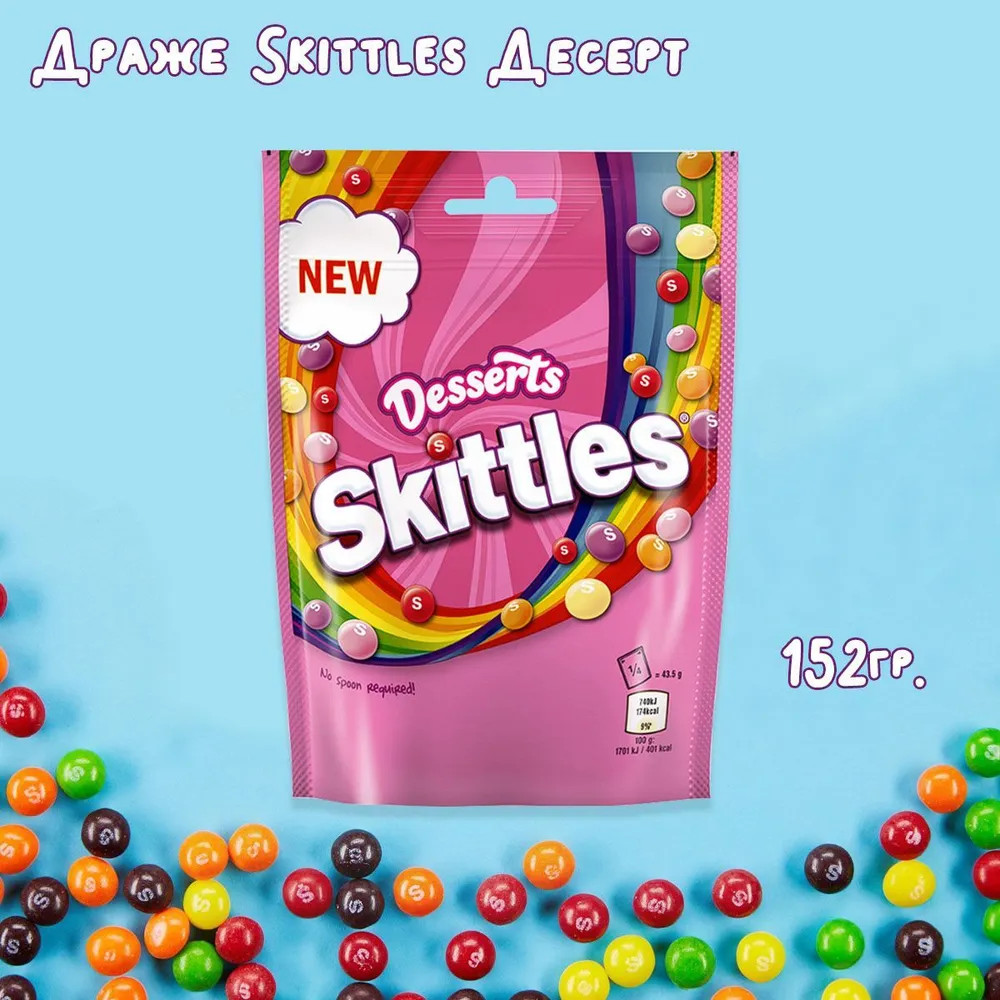 Новейшие вкусы Skittles идеально подходят для ужина или в качестве угощения в середине дня. Skittles Desserts — это восхитительная смесь фруктовых вкусов, вдохновленных десертами, которая привносит изюминку в Skittles Rainbow Flavors. Вкусы включают: апельсиновый крем, малиновый сорбет, клубничный молочный коктейль, пирог с лаймом и черничный пирог. Эти яркие и многоцветные конфетки превратят ваше путешествие в мир вкуса в настоящее приключение!