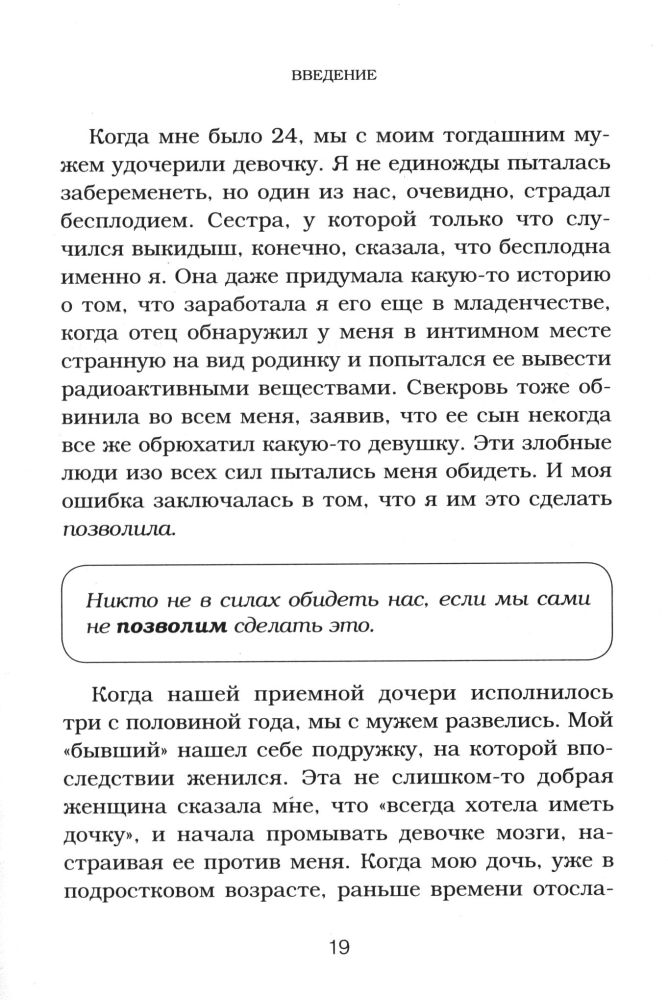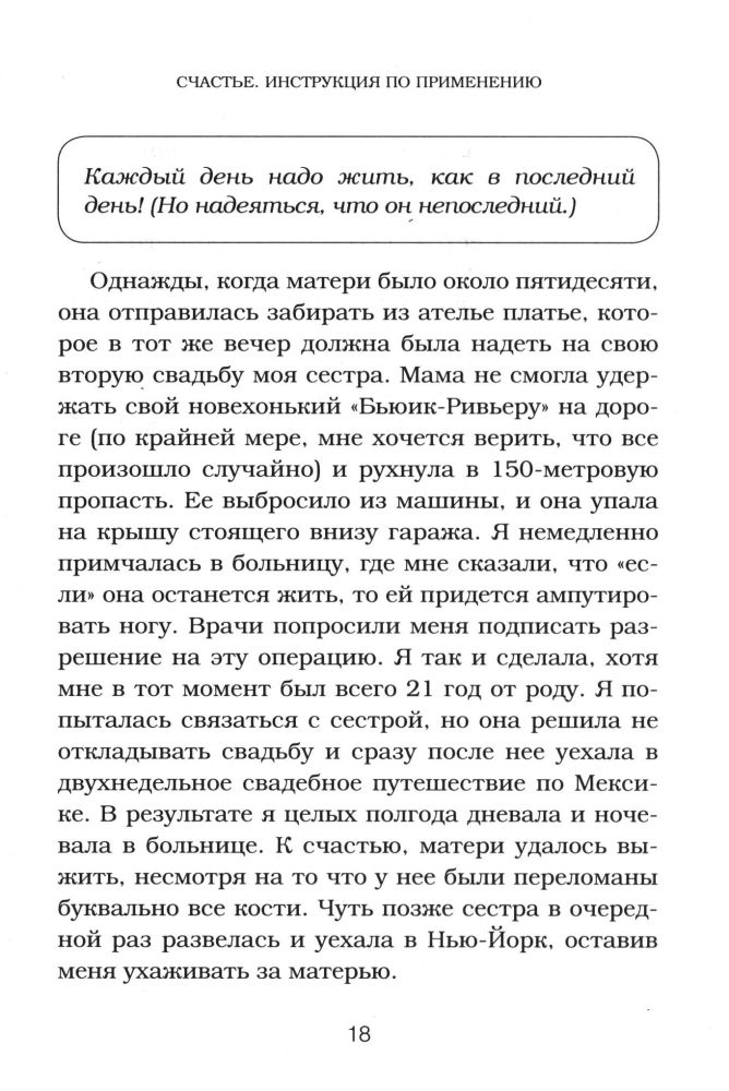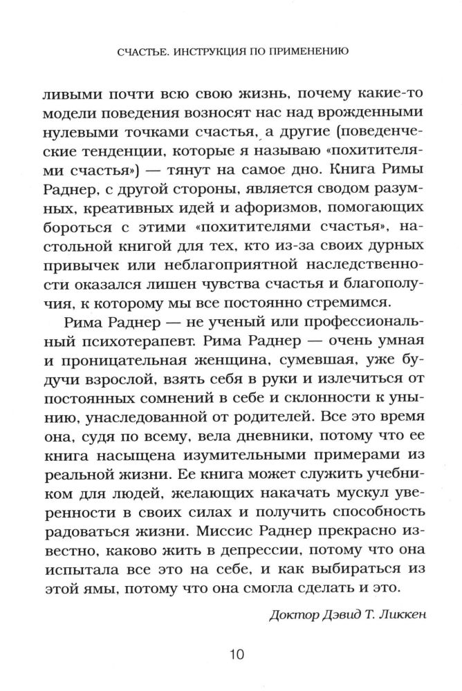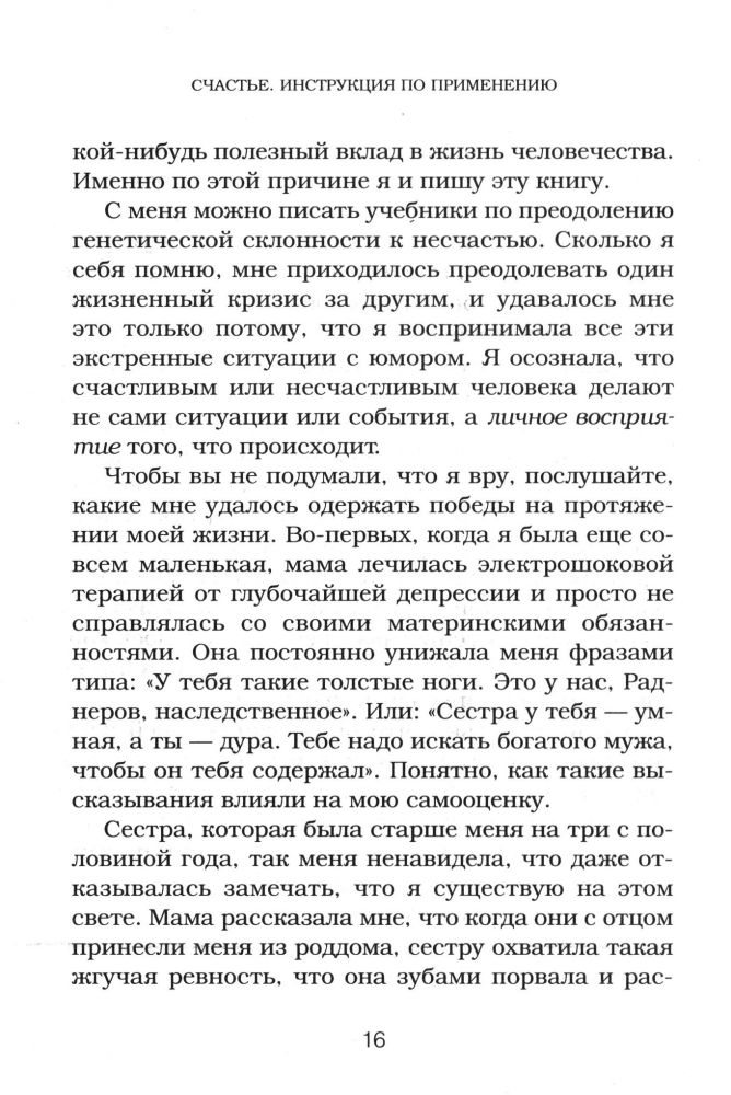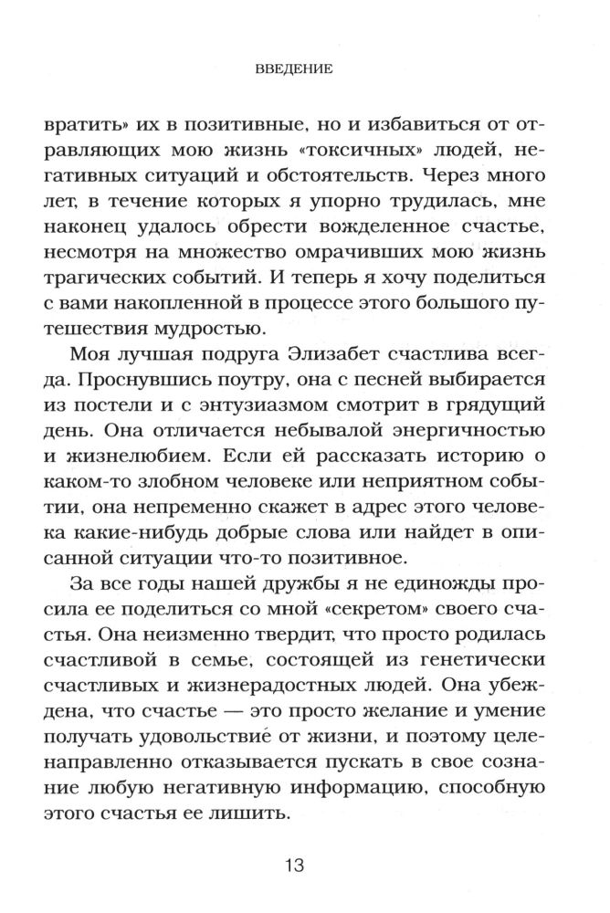 Счастье. Инструкция по применениюВ данный момент этот товар отсутствует в продаже. Возможно, у нас найдется аналогичный или похожий товар здесь. Серия: Выбор редакции. Весенние перемены (обложка) Перестаньте мечтать и надеяться, что счастье придет само, и научитесь создавать его для себя сами. В этой книге специалист по коучингу в области счастья Рима Раднер описывает новаторский «инструментарий счастья», дающий возможность избежать самых распространенных причин несчастья и депрессии, с которыми всем нам время от времени приходится сталкиваться. Вы навсегда избавитесь от чувства беспокойства и вредных привычек, распрощаетесь с обидами и желанием перекладывать ответственность на других; преодолеете страхи и чувство вины; устраните из своей жизни людей, отравляющих вам жизнь; превратите негативные внутренние диалоги в позитивный настрой; поднимете самооценку; избавитесь от ненависти и замените ее чувством любви. Также вы узнаете о правиле «Подожди сутки» и «Принципе пятнадцати процентов», благодаря которым тысячи людей смогли коренным образом изменить свою жизнь. |