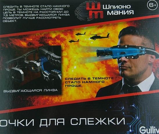 В данный момент этот товар отсутствует в продаже. Возможно, у нас найдется аналогичный или похожий товар здесь. Серия: ШпионоМания Следить в темноте с очками для слежки станет намного проще. Маленький шпион сможет найти свою цель в темноте на расстоянии до 8 метров, а мощная линза позволит рассмотреть предмет слежки в деталях.