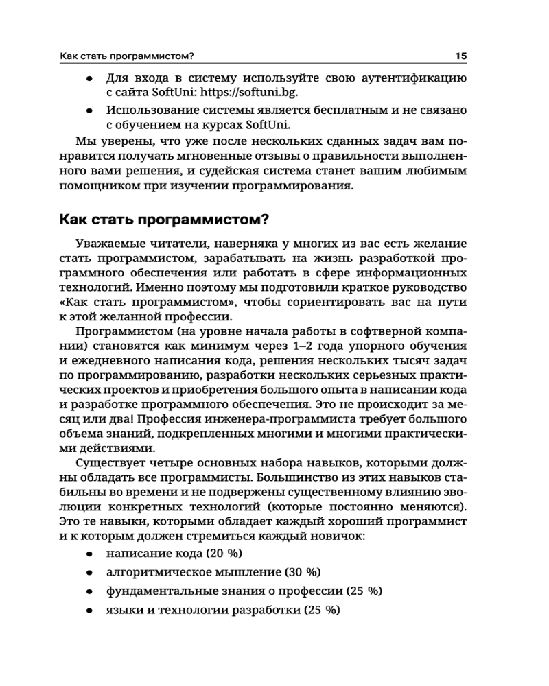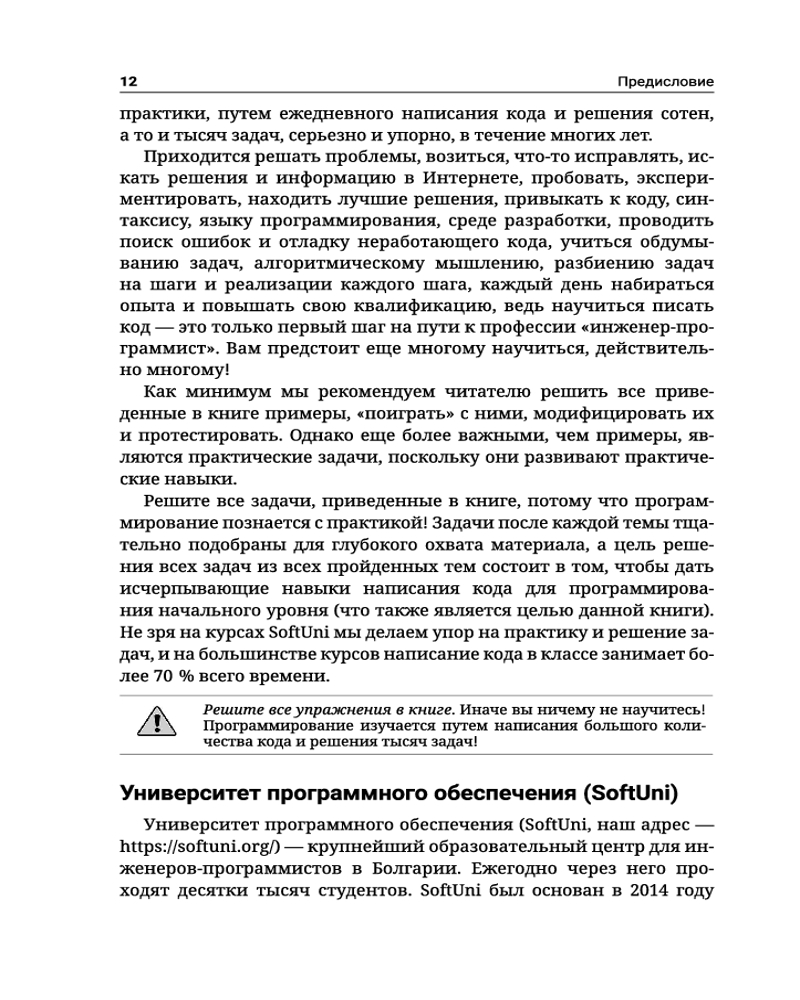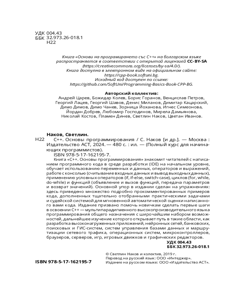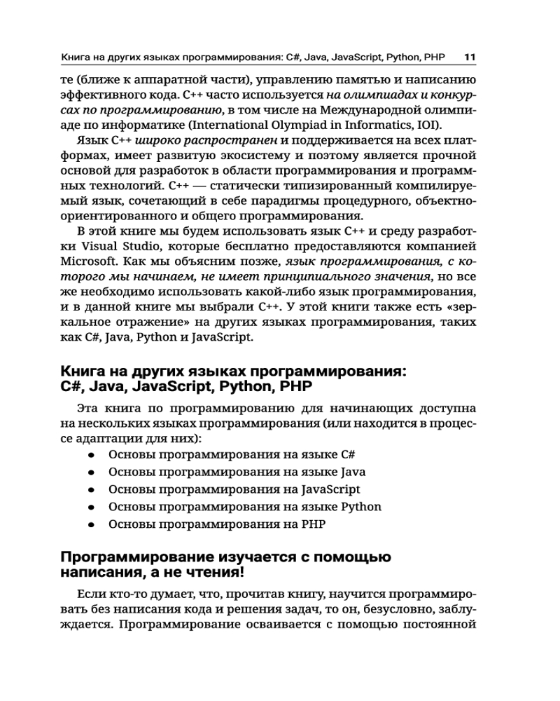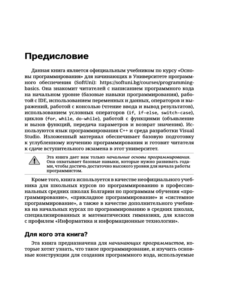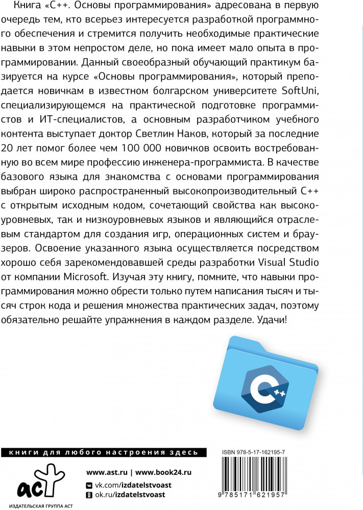 C++. Основы программированияВ данный момент этот товар отсутствует в продаже. Возможно, у нас найдется аналогичный или похожий товар здесь. Серия: Полный курс для начинающих программистов Книга «C++. Основы программирования» знакомит читателей с написанием программного кода в среде разработки (IDE) на начальном уровне, обучает использованию переменных и данных, операторов и выражений, работе с консолью (считывание входных данных и вывод выходных данных), применению условных операторов (if, if-else, switch-case), циклов (for, while,do-while) и функций (объявление и вызов функций, передача параметров и возврат значений). Основной упор в издании сделан на упражнениях: здесь приведено множество подробно прокомментированных примеров кода, дополненных тщательно отобранными практическими задачами и судейской системой для мгновенной автоматической оценки написанного вами кода. |