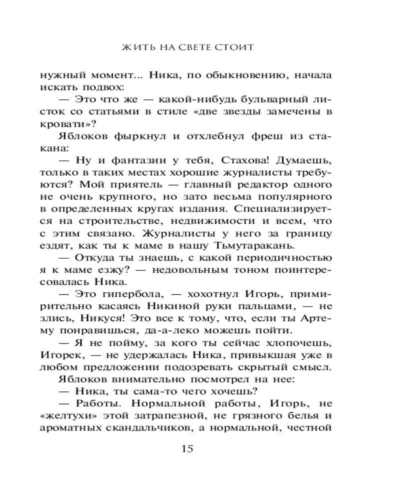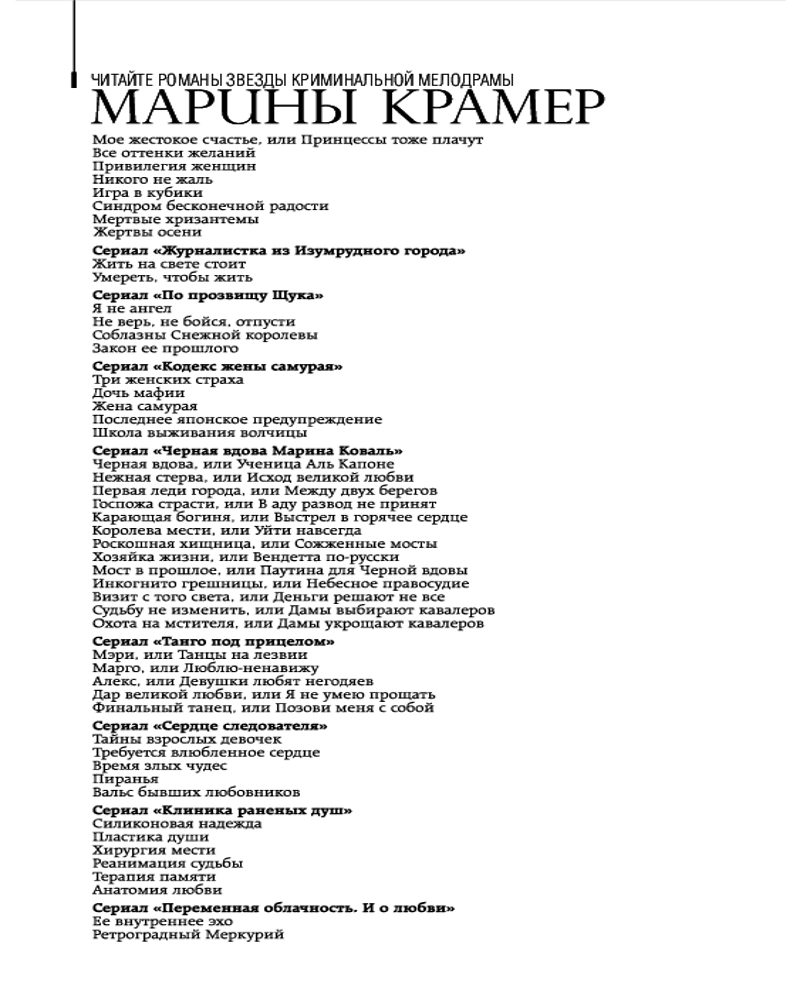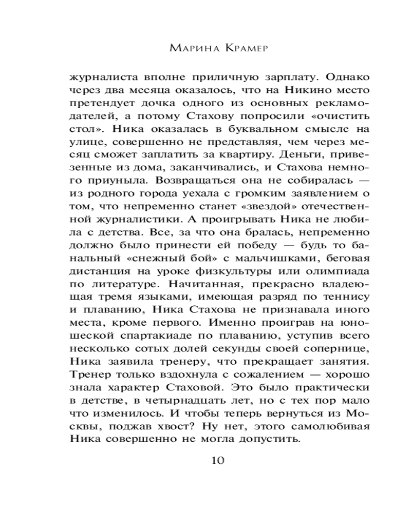 Жить на свете стоитВ данный момент этот товар отсутствует в продаже. Возможно, у нас найдется аналогичный или похожий товар здесь. Серия: Закон сильной. Криминальное соло Марины Крамер. Новое оформление Журналистке Веронике Стаховой повезло! Ей выпал шанс взять интервью у бизнесмена Максима Гавриленко. Вероника в своей статье описала лишь положительный облик олигарха. Однако после «редактирования» руководством газеты она просто не узнает текст. Следом за публикацией, написанной главным редактором, но подписанной Стаховой, девушка получает анонимные письма с угрозами... Через пару недель в ее квартире происходит взрыв бытового газа. А Вероника попадает на очередное рандеву с Максимом. Теперь на вопросы предстоит отвечать уже ей самой... |