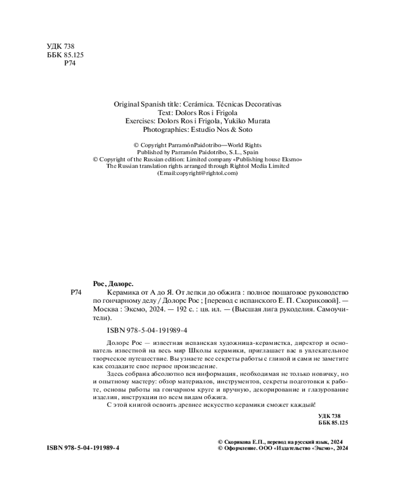 💳 Оплатить за товар можно при получении 🇰🇿 Есть бесплатная доставка по Казахстану от 1 дня 🎁 Копите бонусы с каждой покупки Серия: Высшая лига рукоделия. Самоучители Известная испанская художница-керамистка, директор и основатель известной на весь мир Школы керамики, Долорс Рос, представляет полное и доступное пошаговое руководство по освоению одного из самых популярных видов творчества — гончарного мастерства! Перед вами самое понятное и детальное руководство, включающее всё необходимое для создания уникальных авторских проектов как вручную, так и на гончарном круге. Эта книга подарит море вдохновения и бесценные навыки! Скорее окунитесь в увлекательный процесс создания керамики! |