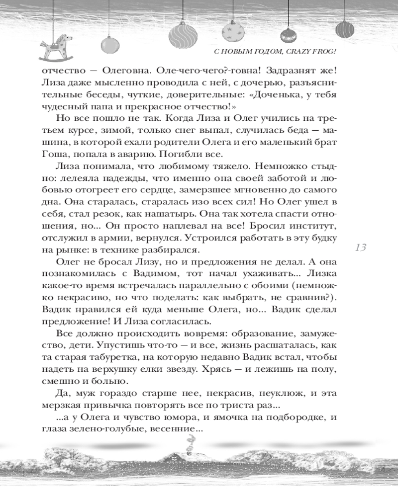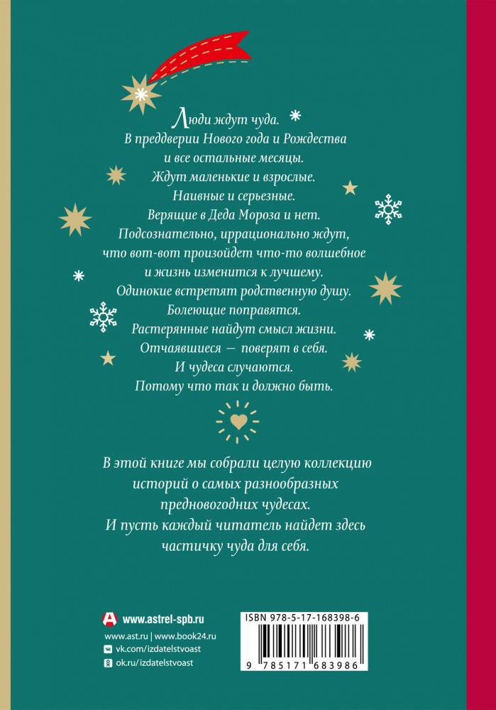 Открыть 31 декабря. Новогодние рассказы о чудеВ данный момент этот товар отсутствует в продаже. Возможно, у нас найдется аналогичный или похожий товар здесь. Серия: Праздник-Праздник Люди ждут чуда. В преддверии Нового года и Рождества и все остальные месяцы. Ждут маленькие и взрослые. Наивные и серьезные. Верящие в Деда Мороза и нет. Подсознательно, иррационально ждут, что вот-вот произойдет что-то волшебное и жизнь изменится к лучшему. Одинокие встретят родственную душу. Болеющие поправятся. Растерянные найдут смысл жизни. Отчаявшиеся — поверят в себя. И чудеса случаются. Потому что так и должно быть. В этой книге мы собрали целую коллекцию историй о самых разнообразных предновогодних чудесах. И пусть каждый читатель найдет здесь частичку чуда для себя. |