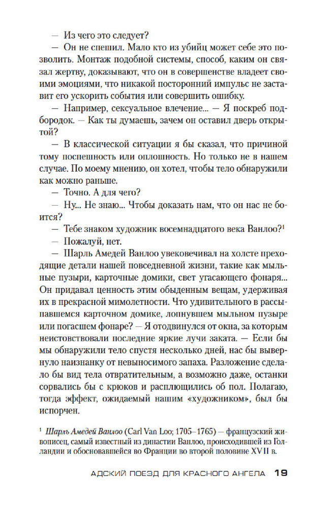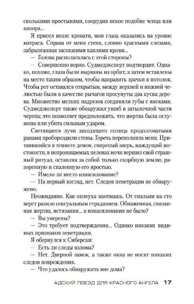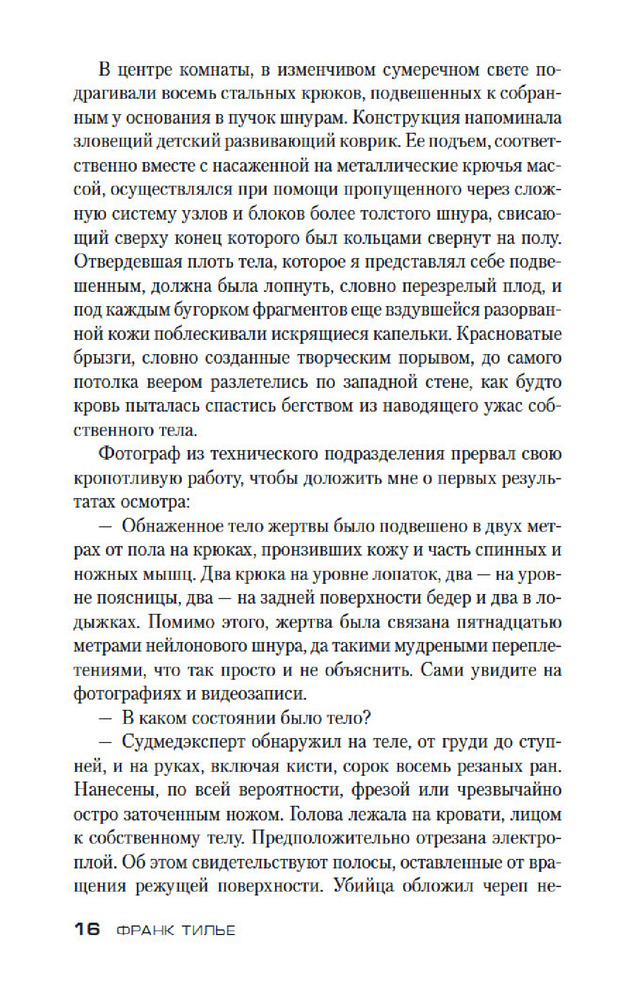 Роман не для слабонервных. Сначала, прочитав первую главу я ужаснулась от описания сцены убийства. Но потом затянулась в расследование. Думаю на любителя кто в восторге от этого писателя. Пока мне хватило одного романа. Жизнь и так жестокая а от таких книг еще мрачные. Пишет хорошо, понятно .