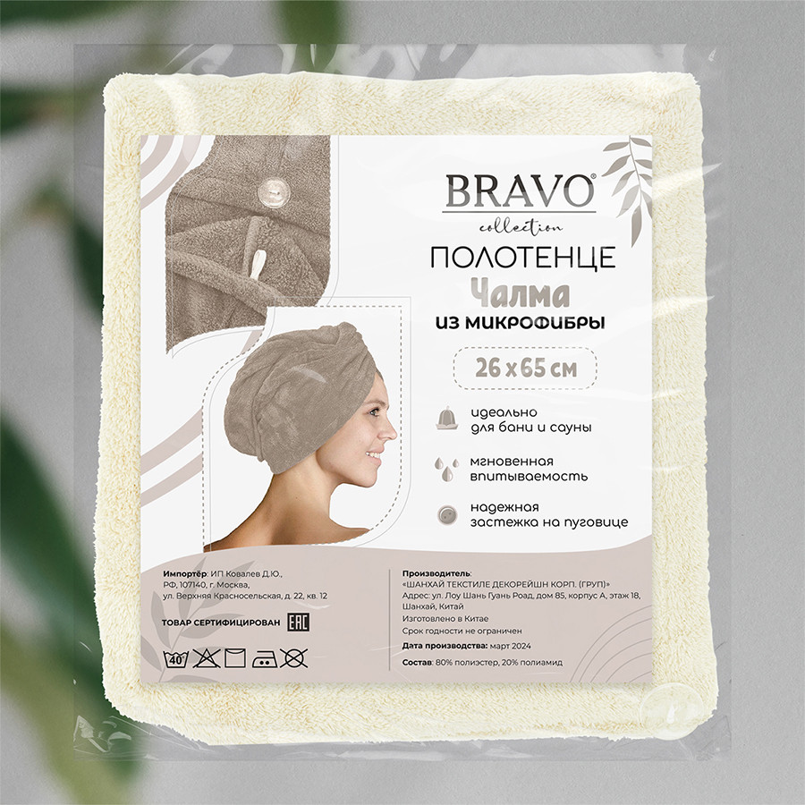 Полотенце-чалма для волос, изготовлено из микрофибры. Произведено в Китае, состав : 80% полиэстер, 20% полиамид, плотность 300г/м2. Каждое полотенце в индивидуальном п/п пакете, есть картонная карточка с описанием товара. Материал микрофибра — достойная альтернатива хлопку, не уступает в потребительских свойствах, при этом значительно дешевле. Такие полотенца нужны и дома, и в бане или сауне. |