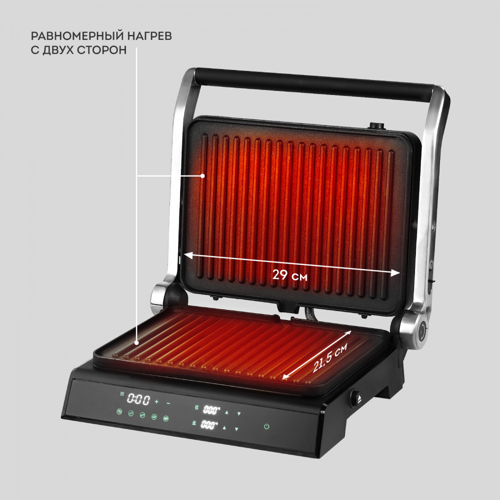 Мультигриль Galaxy Line GL2984 мощностью 2200 Вт быстро поджарит мясо до румяной корочки без добавления масла, приготовит сочные котлеты, подрумянит овощи, поджарит колбаски и рыбу для самого вкусного и полезного ужина. Благодаря качественному антипригарному покрытию рабочих поверхностей блюда с хрустящей корочкой получаются без добавления масла. Возможность установки программы приготовления, температуры в диапазоне 90-230 °С и времени от 1 минуты до 4 часов позволяют готовить по любым рецептам. Верхняя нагревательная панель автоматически подстраивается под высоту продуктов. Такая конструкция гриля позволяет готовить бутерброды и мясо любой толщины.