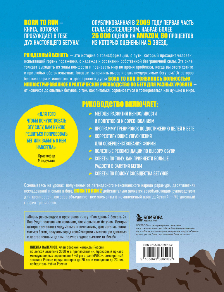 💳 Оплатить за товар можно при получении 🇰🇿 Есть бесплатная доставка по Казахстану от 1 дня 🎁 Копите бонусы с каждой покупки Серия: Сам себе тренер Рожденный бежать — это история о трансформации, о пути, который проходит человек, испытавший горечь поражения, о надежде и осознании собственной безграничной силы. Эта сила толкает выходить из зоны комфорта и познавать мир во время пробежки, когда вы этого хотите и при любых обстоятельствах. Готов ли ты принять вызов и стать неудержимым бегуном? От авторов бестселлера и известного тренерского дуэта born to run появилось полностью иллюстрированное практическое руководство по бегу для разных уровней — от новичков до опытных бегунов, о том, как питаться, соревноваться и тренироваться как лучшие в мире. |