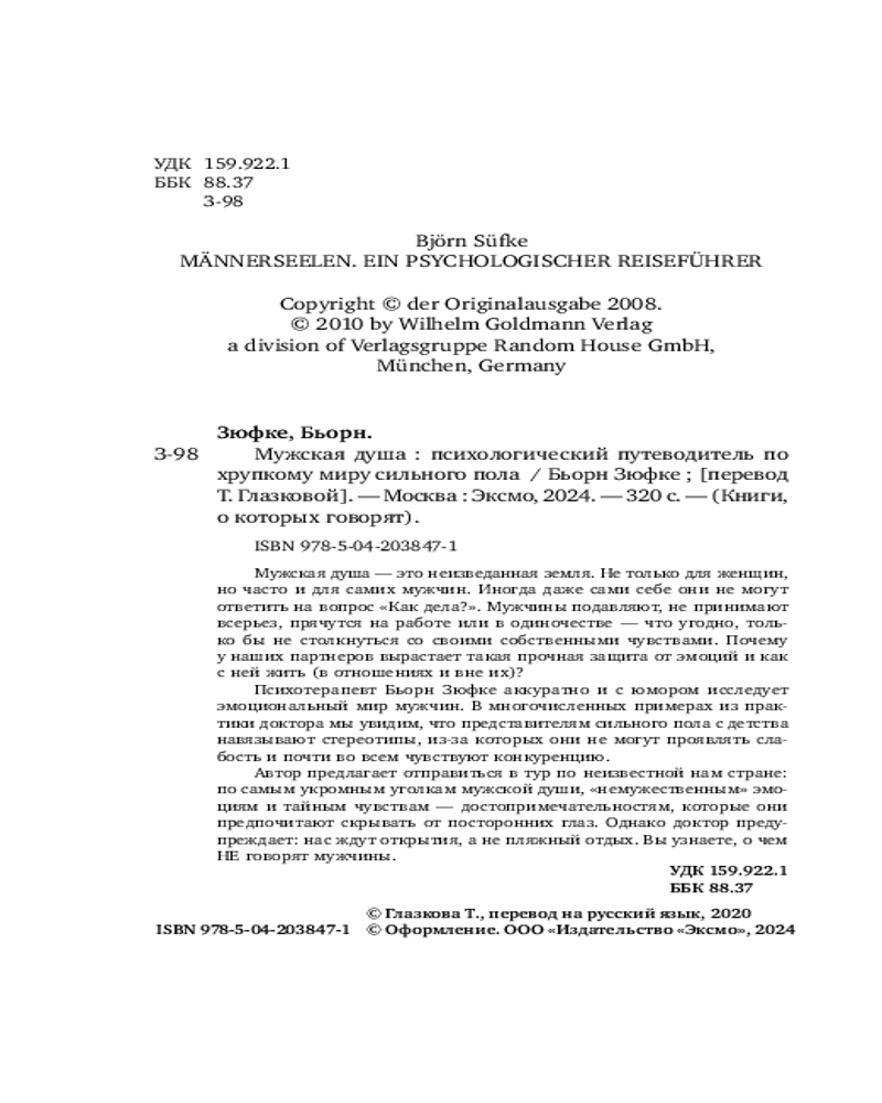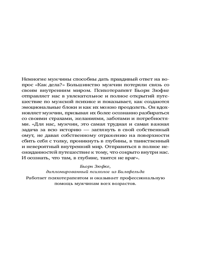 💳 Оплатить за товар можно при получении 🇰🇿 Есть бесплатная доставка по Казахстану 🎁 Копите бонусы с каждой покупки Серия: Книги, о которых говорят Эта книга написана мужчиной о мужчинах. Психотерапевт Бьорн Зюфке устроил нам экскурсию в мир мужской души, основанную на многолетней работе с клиентами. Только в путешествии речь идет не о радости, гордости, любви или страсти, а преимущественно о чувствах, которые обычно считаются негативными или «немужскими». Самая сложная задача для мужчины — заглянуть внутрь себя, признать свои чувства, новые или несвойственные, и, анализируя их, не дать сбить себя с толку. «Мужская душа» — книга, которая необходима и женщинам, и мужчинам. Первые с ее помощью смогут лучше понять своего партнера и объяснить себе его поступки, мужчины — вернуть потерянный доступ к собственному внутреннему миру. |