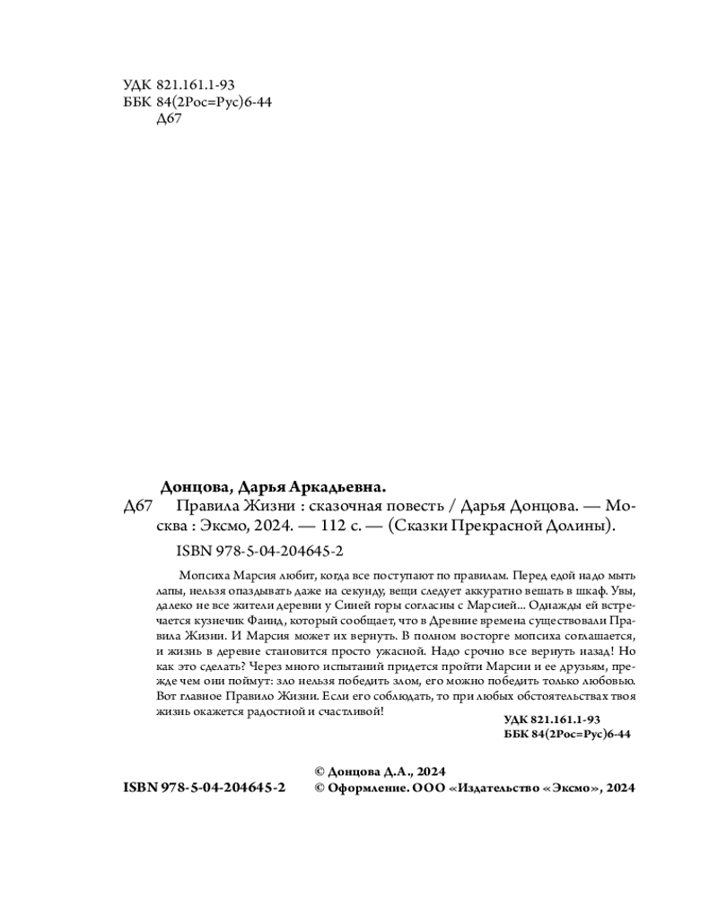 💳 Оплатить за товар можно при получении 🇰🇿 Есть бесплатная доставка по Казахстану 🎁 Копите бонусы с каждой покупки Серия: Сказки Прекрасной Долины Мопсиха Марсия любит, когда все поступают по правилам. Перед едой надо мыть лапы, нельзя опаздывать даже на секунду, вещи следует аккуратно вешать в шкаф. Увы, далеко не все жители деревни у Синей горы согласны с Марсией... Однажды ей встречается кузнечик Фаинд, который сообщает, что в Древние времена существовали Правила Жизни. И Марсия может их вернуть. В полном восторге мопсиха соглашается, и жизнь в деревне становится просто ужасной. Надо срочно все вернуть назад! Но как это сделать? Через много испытаний придется пройти Марсии и ее друзьям, прежде чем они поймут: зло нельзя победить злом, его можно победить только любовью. Вот главное Правило Жизни. Если его соблюдать, то при любых обстоятельствах твоя жизнь окажется радостной и счастливой! |