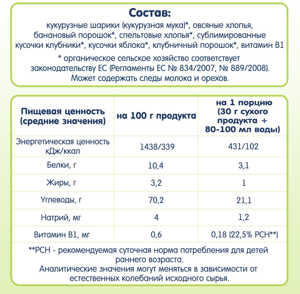 💳 Оплатить за товар можно при получении 🇰🇿 Есть бесплатная доставка по Казахстану от 1 дня 🎁 Копите бонусы с каждой покупки Каша мультизлаковая Fleur Alpine банан, клубника, яблоко с кукурузными шариками, овсяными и спельтовыми хлопьями — идеальный готовый завтрак-мюсли для детей, которые освоили первые навыки жевания, и для всех членов семьи. Шарики из органической кукурузной муки, смесь овсяных и спельтовых хлопьев хорошо впитывают и удерживают жидкость, становятся мягкими, при этом отлично сохраняют свою форму. |