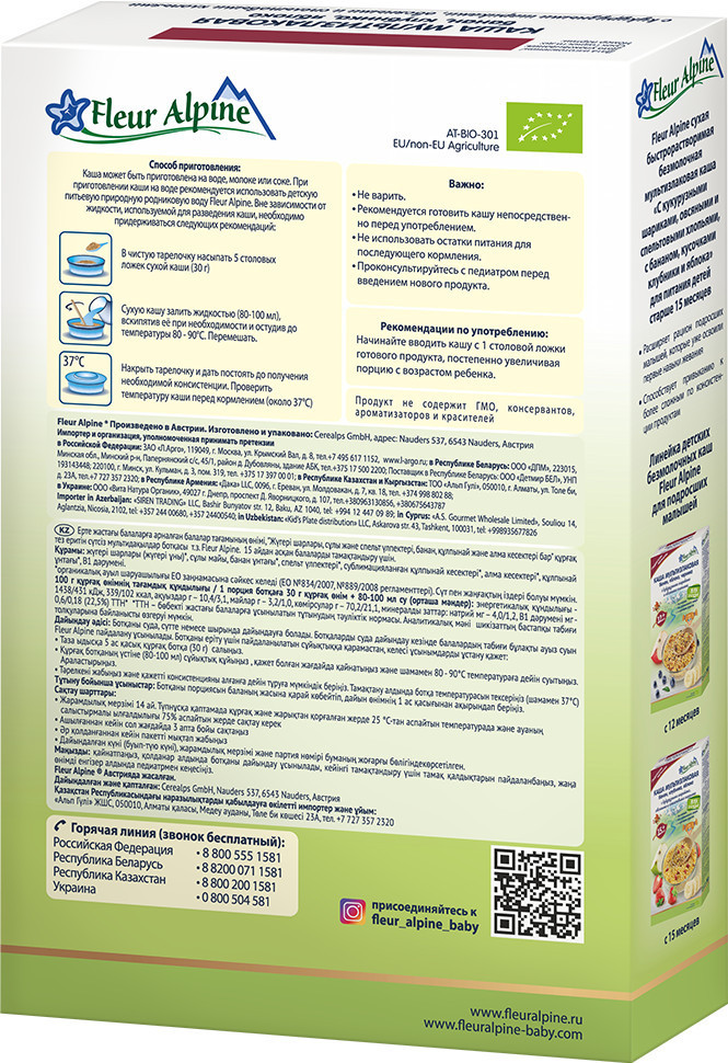 Fleur Alpine Каша мультизлаковая с кукурузными шариками, овсяными и спельтовыми хлопьями «Банан, клубника, яблоко»-30% +35