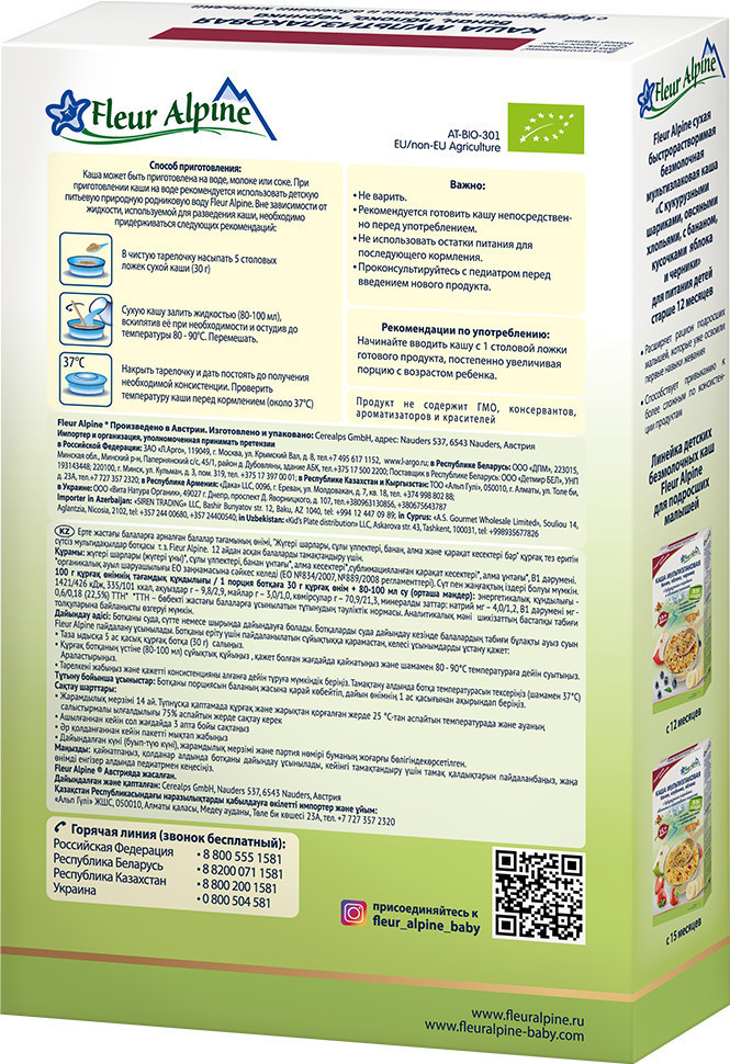 Fleur Alpine Каша мультизлаковая с кукурузными шариками и овсяными хлопьями «Банан, яблоко, черника»-30% +35