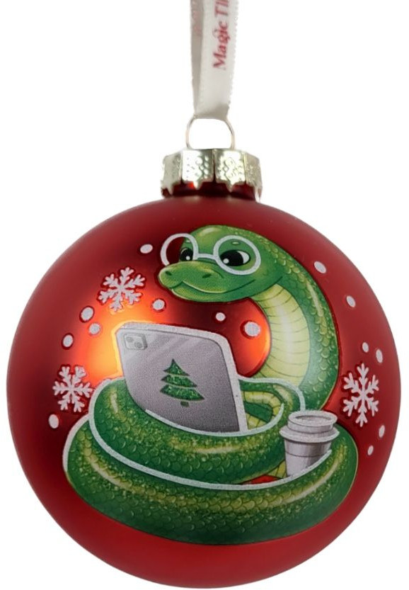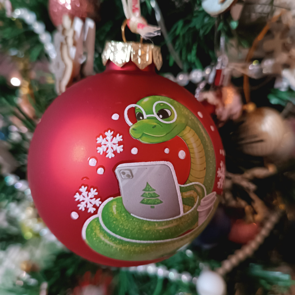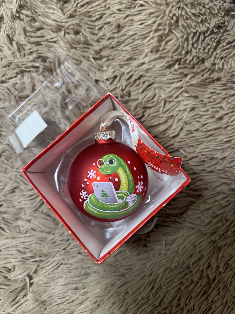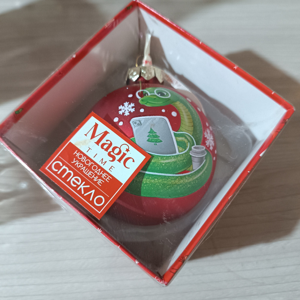 Прекрасный шарик с символом 2025 года. Все целое, змея хорошо прорисована. Сам шарик довольно крупный, на елке смотрелся просто замечательно.