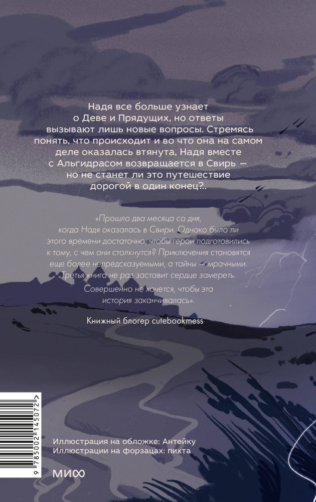 💳 Оплатить за товар можно при получении 🇰🇿 Есть бесплатная доставка по Казахстану от 1 дня 🎁 Копите бонусы с каждой покупки Серия: Прядущая Надя все больше узнаёт о Деве и Прядущих, но ответы вызывают лишь новые вопросы. Стремясь понять, что происходит и во что она на самом деле оказалась втянута, Надя вместе с Альгидрасом возвращается в Свирь — но не станет ли это путешествие дорогой в один конец?.. |