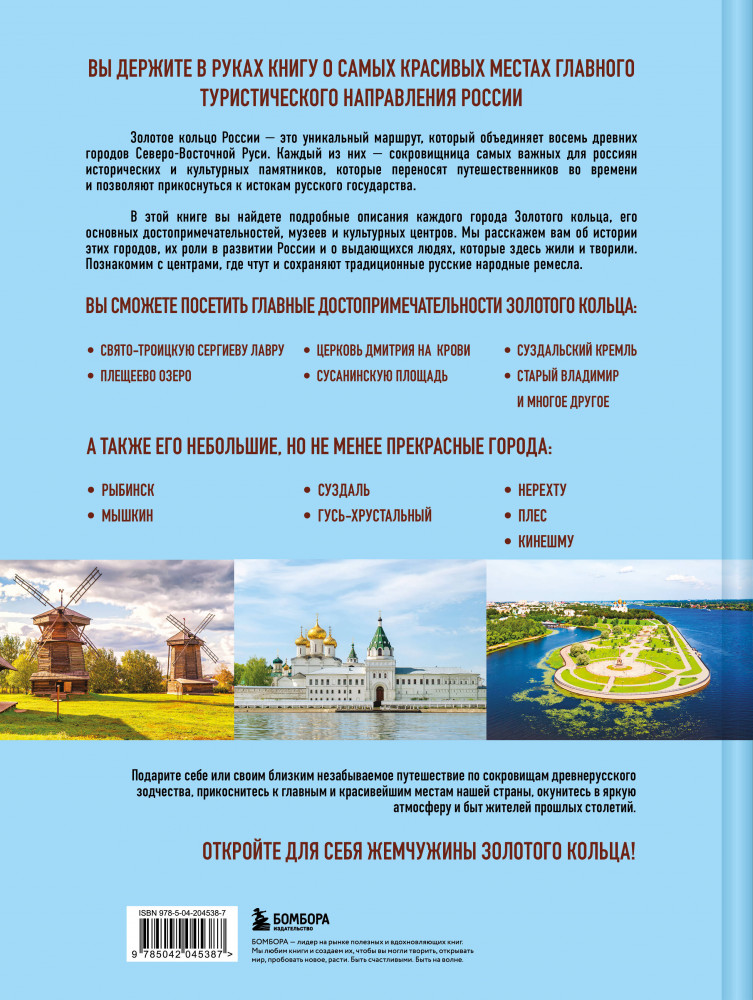 Серия: Подарочные издания. Туризм. Путешествия по России Откройте для себя сокровища древнерусского зодчества, окунувшись в путешествие по городам Золотого кольца. Эта книга приглашает вас совершить увлекательную прогулку по историческим улицам, полюбоваться великолепными соборами и монастырями, узнать тайны и легенды, связанные с этими уникальными местами. Вы узнаете о легендарных князьях и царях, которые оставили свой след в архитектуре и культуре городов Золотого кольца. Проследите за развитием древнерусского искусства, любуясь фресками и иконами, созданными искусными мастерами и создадите незабываемые впечатления. |