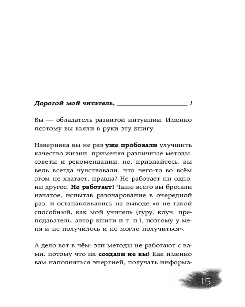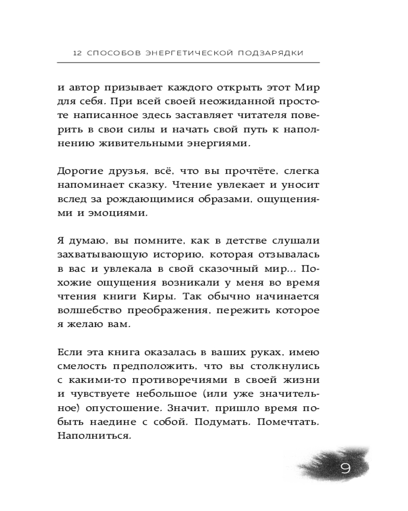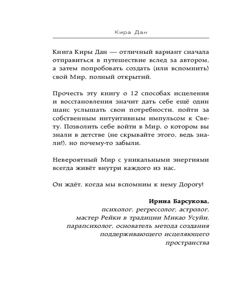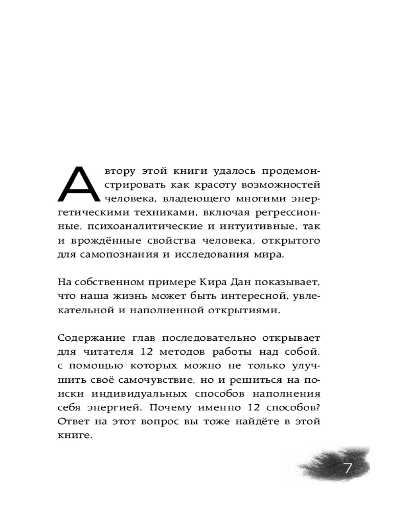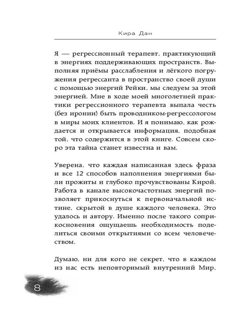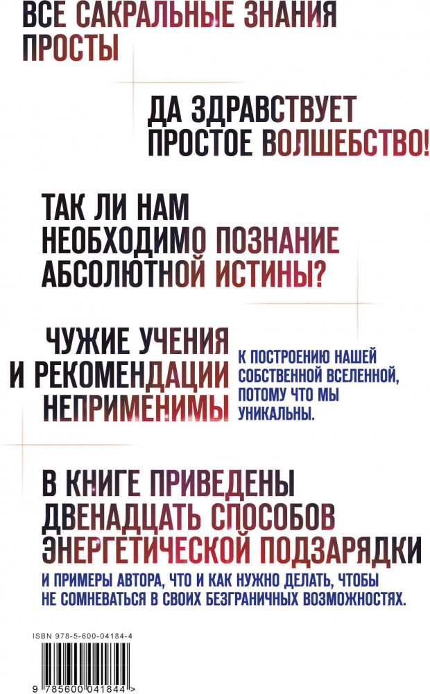 Серия: Говорят эксперты. Практичные книги от специалистов своего дела Кира Дан — ученый в области космической прикладной инженерии (rocket science). С годами данных фундаментальной науки ей становилось недостаточно, и потребовались знания эзотерики и философии в широком смысле. Кира Дан начала обращать свои размышления о Вселенной в слова, создавая тексты, полные загадок и философских размышлений. Это её первая — дерзкая и ломающая стереотипы — книга о тайнах энергетического существования человека на Земле и создания своей собственной Вселенной. Ее убеждение заключается в том, что каждый индивидуум на планете должен отыскать именно свой путь. Она считает, что осознание своего призвания и поиск смысла собственного воплощения являются ключом к коллективной эволюции человечества. Ее миссия — очень просто рассказать о сложном и загадочном. Книга убеждает читателя, что всем пора осознать, что не существует учителя, гуру, наставника, который укажет нам путь к ресурсному состоянию и смысл жизни. Чужие учения и рекомендации неприменимы к построению нашей собственной Вселенной, потому что мы уникальны. В книге приведены двенадцать способов энергетической подзарядки и примеры автора, что и как нужно делать, чтобы не сомневаться в своих безграничных возможностях. |