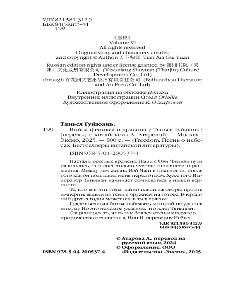 Серия: Freedom. Песнь о небесах. Бестселлеры китайской литературы Заключительный, шестой том полюбившегося цикла «Песнь о Небесах» популярной писательницы Тянься Гуйюань. Для империи Тяньшэн настали непростые времена. Пути Нин И и Фэн Чживэй разошлись, жизнь Вэй Чжи находится в опасности, а враги империи, которые до этого тайно плели заговоры против империи, вышли из тени. Грядет великая битва, избежать которую не удастся никому. Но это не самое ужасное, что ждет Тяньшэн. Свершилось то, чего так боялся император — пророчество, согласно которому его сын, Нин И, перевернет весь мир, а поможет ему в этом не кто иная, как Фэн Чживей, потому что, сойдясь вместе, феникс и дракон способны низвергнуть Небеса. |