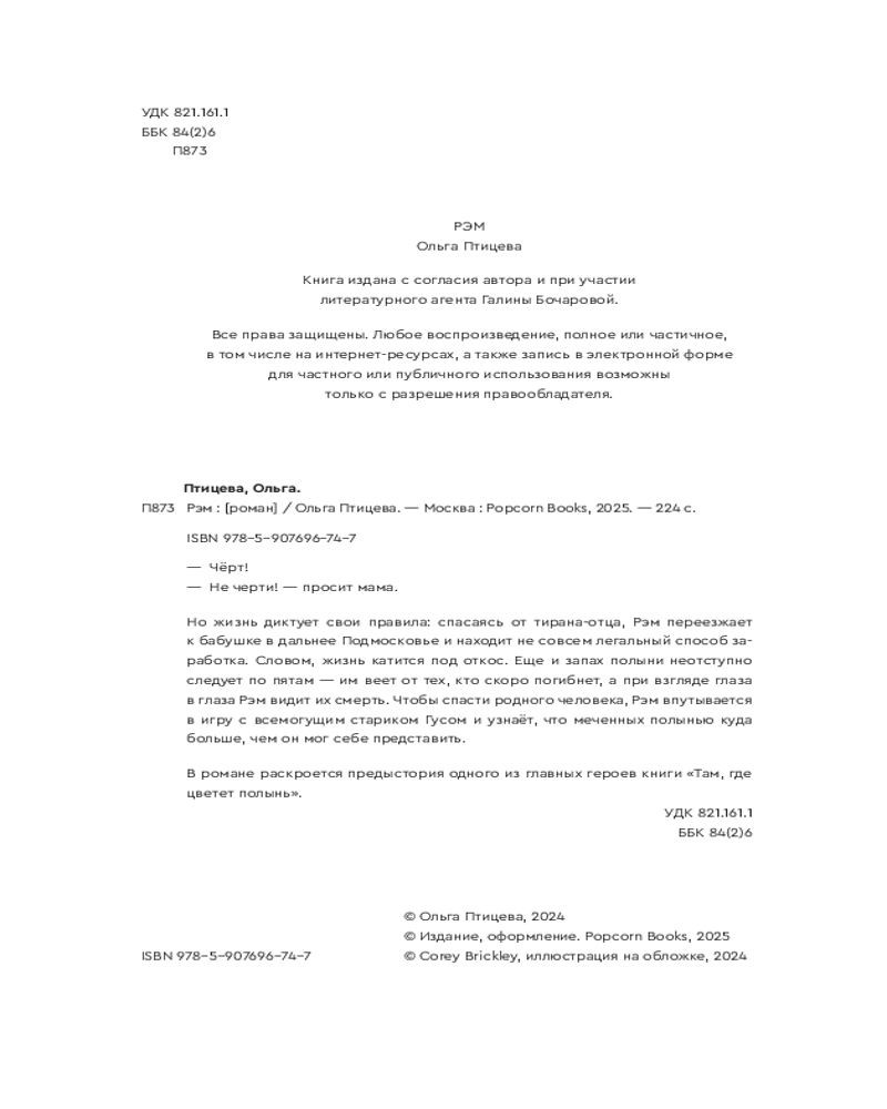 Но жизнь диктует свои правила: спасаясь от тирана-отца, Рэм переезжает к бабушке в дальнее Подмосковье и находит не совсем легальный способ заработка. Словом, жизнь катится под откос. Еще и запах полыни неотступно следует по пятам — им веет от тех, кто скоро погибнет, а при взгляде глаза в глаза Рэм видит их смерть. Чтобы спасти родного человека, Рэм впутывается в игру с всемогущим стариком Гусом и узнаёт, что меченных полынью куда больше, чем он мог себе представить. В романе раскроется предыстория одного из главных героев книги «Там, где цветет полынь».