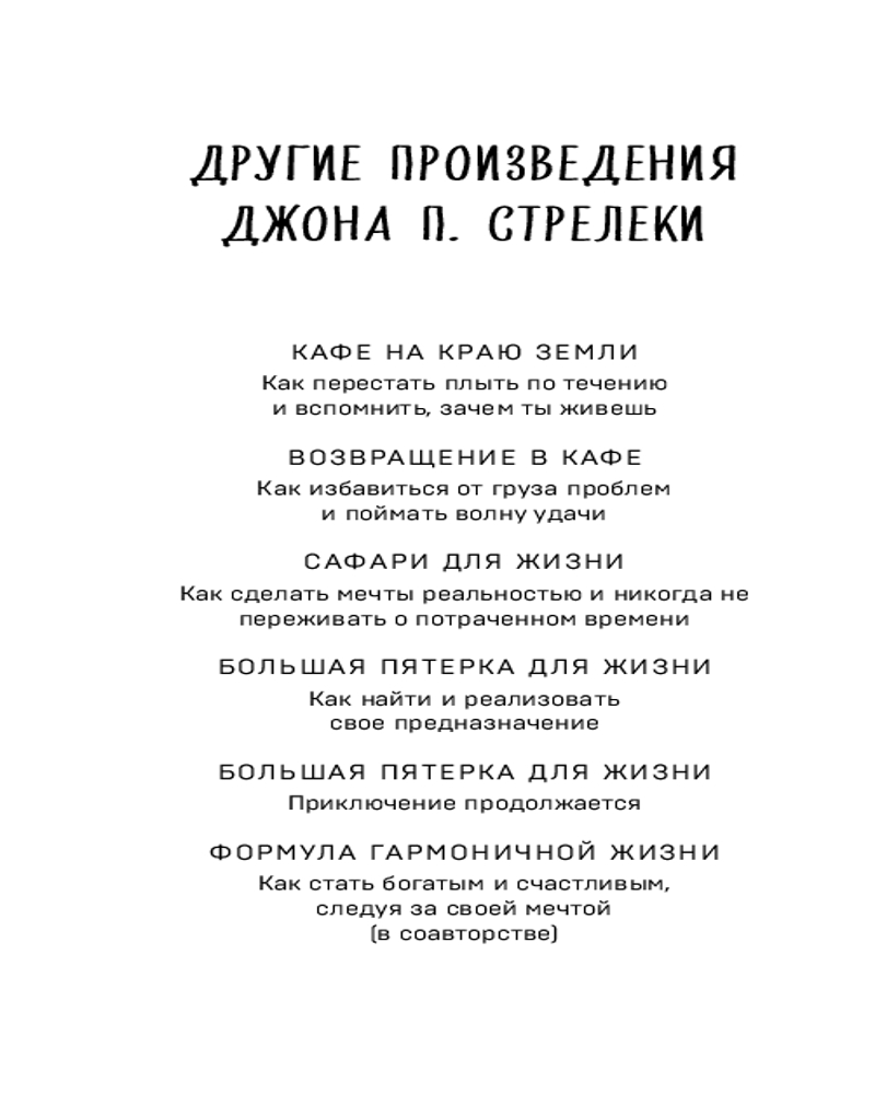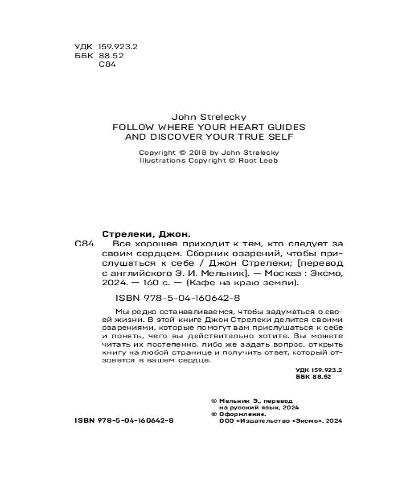 💳 Оплатить за товар можно при получении 🇰🇿 Есть бесплатная доставка по Казахстану от 1 дня 🎁 Копите бонусы с каждой покупки Серия: Кафе на краю земли. Вдохновляющие открытия Джона Стрелеки Новая книга из серии «Кафе на краю земли» понравится всем ценителям философии Джона Стрелеки. Это третья часть книг с мудрыми озарениями автора, которые могут стать вашей ежедневной поддержкой. В отличие от первых двух книг, «Не ищите апельсины в черничном поле» и «Что хорошего в красивом пейзаже, если вы не смотрите в окно», в этой вы найдете истории, похожие на притчи. Как читать эту книгу? |