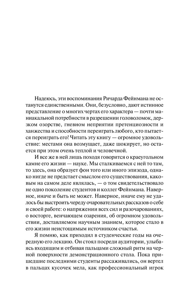 Честно сказать ожидала немного большего, видимо после книг Мичио Каку, ожидала услышать от физика что нибудь про физику. Как выяснилось, эта книга больше описывает некоторые смешные ситуации из жизни Фейнмана, удивительного и в то же время обычного человека. Интересно было читать о его участии в Манхэтенском проекте, взгляд изнутри. В целом книга интересная и легкая для читателя.