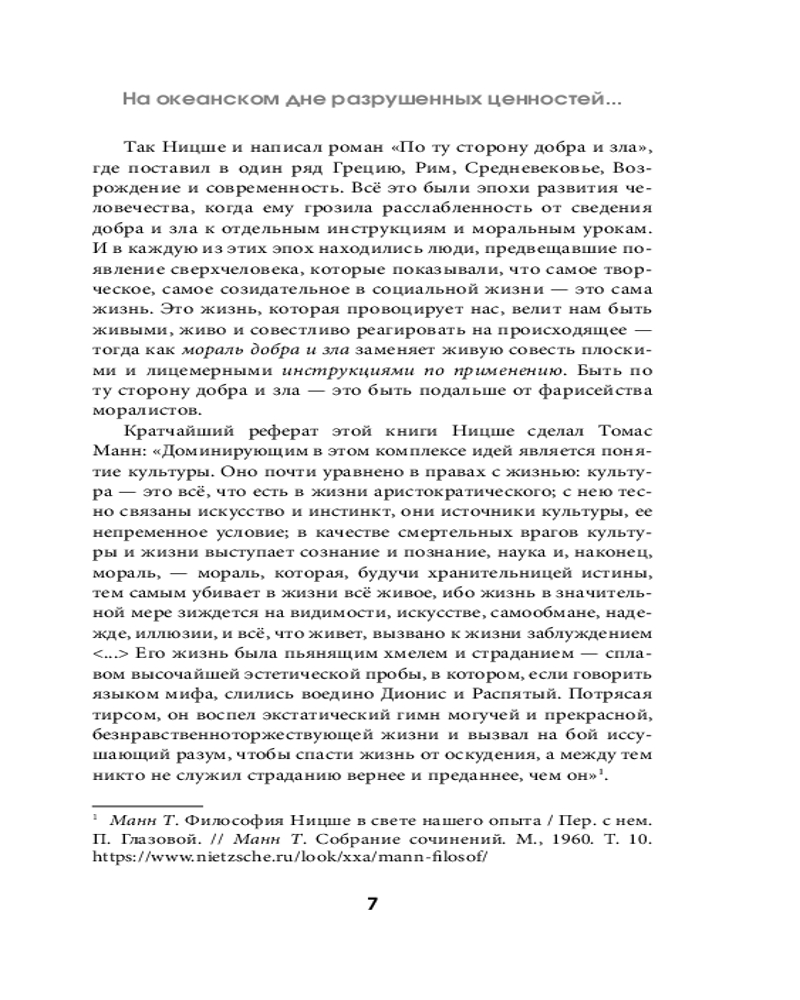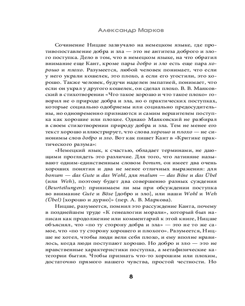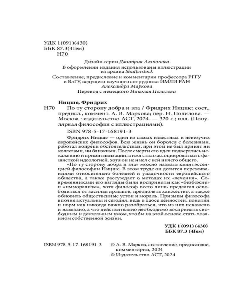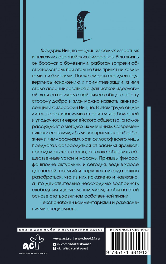 💳 Оплатить за товар можно при получении 🇰🇿 Есть бесплатная доставка по Казахстану от 1 дня 🎁 Копите бонусы с каждой покупки Серия: Популярная философия с иллюстрациями Фридрих Ницше — один из самых известных и невезучих европейских философов. Всю жизнь он боролся с болезнями, работал вопреки обстоятельствам, при этом не был принят ни коллегами, ни близкими. После смерти его идеи подверглись искажению и примитивизации, а имя стало ассоциироваться с фашисткой идеологией, хотя он не имел с ней ничего общего. «По ту сторону добра и зла» можно назвать квинтэссенцией философии Ницше. В этом труде он делится переживаниями относительно болезней и упадочности европейского общества, а также рассуждает о методах их «лечения». Современниками его взгляды были восприняты как «безбожие» и «имморализм», хотя философ всего лишь предлагал освободиться от засилья ярлыков, преодолеть ханжество, а также обновить общественные устои и мораль. Призывы философа вполне актуальны и сегодня, ведь в хаосе ценностей, понятий и норм как никогда важно разобраться, что из них искажено и навязано, а что действительно необходимо воспринять свободным и деятельным умом, чтобы на этой основе стать хозяином собственной жизни. Текст снабжен комментариями и разъяснениями специалиста. |
