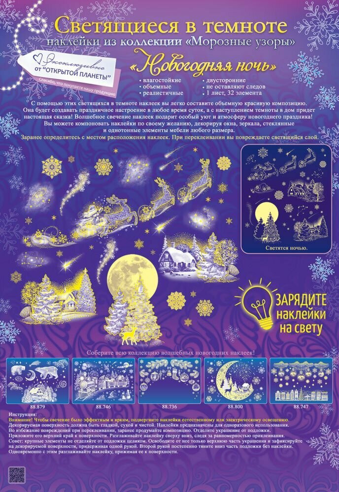Открытая планета Набор наклеек для окон светящихся «Новогодняя ночь»В данный момент этот товар отсутствует в продаже. Возможно, у нас найдется аналогичный или похожий товар здесь. Волшебные наклейки, которые светятся в темноте — они заряжают хорошим настроением днем и дарят уют ночью! Наклейки подходят для любых гладких поверхностей (кроме бумажных обоев). Кроме того, они двусторонние — а это удачное решение для декорирования окон, витрин, стеклянных дверей. Они одинаково эффектно смотрятся и изнутри, и снаружи. Легко клеятся и легко снимаются, не оставляя следов. Влагостойкие. Перед использованием, зарядите наклейки на свету. Блестки в лаке флуоресцентные. |
