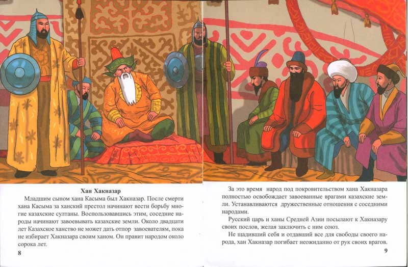 У нас в магазинах практически нет детских книг о Казахстане. Вот поэтому на пробу взяла такую книгу, из остальных двух подобных - эта книга самая интересная. Красочные картинки, понятный для ребенка текст, коротко говорится о ханах, образовавших Казахское ханство.
