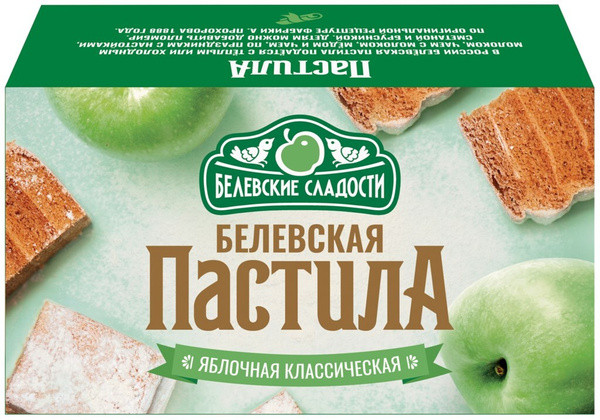 История: «В 1888 году промышленник и купец Амвросий Павлович Прохоров на основе старинных народных рецептов, которые он обобщил, получил свой собственный ни с чем не сравнимый рецепт пастилы и дал ей название «Белёвская». Яблочная пастила быстро завоевала свой первый приз на выставке садоводства в Санкт-Петербурге, став одним из любимых лакомств царской семьи. Белёвскую пастилу стали охотно покупать во многих городах России, а также экспортировать для высоких особ Франции, Испании, Италии, Болгарии, Голландии, Англии и многих других стран».