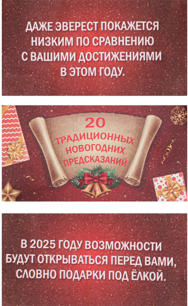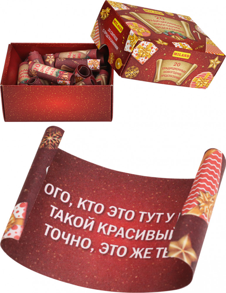 Миленд Коробочка с предсказаниями «20 традиционных предсказаний»В данный момент этот товар отсутствует в продаже. Возможно, у нас найдется аналогичный или похожий товар здесь. Коробочка с предсказаниями собственной разработки — это загадочный и увлекательный товар, который принесет в вашу жизнь забаву и интригу. Каждая коробочка содержит набор красочных карточек с различными предсказаниями, которые могут иметь отношение к вашему будущему, личным отношениям, карьере или другим сферам жизни. Вам достаточно просто вытянуть одну карточку из коробочки, чтобы узнать, какие тайны и события судьба приготовила для вас. Этот товар станет отличным подарком для любителей загадок, тайн и всеобщего интереса к будущему. Откройте коробочку с предсказаниями и погрузитесь в мир неизведанного! |