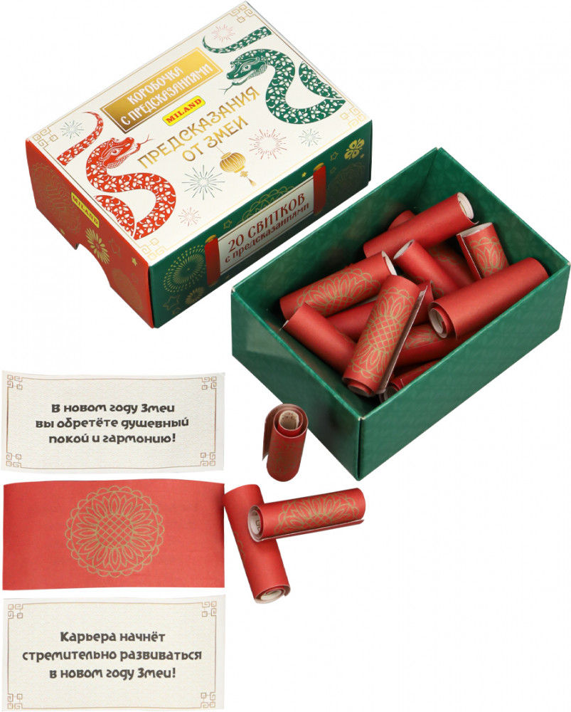 Миленд Коробочка с предсказаниями «Предсказания от змеи»В данный момент этот товар отсутствует в продаже. Возможно, у нас найдется аналогичный или похожий товар здесь. Коробочка с предсказаниями собственной разработки — это загадочный и увлекательный товар, который принесет в вашу жизнь забаву и интригу. Каждая коробочка содержит набор красочных карточек с различными предсказаниями, которые могут иметь отношение к вашему будущему, личным отношениям, карьере или другим сферам жизни. Вам достаточно просто вытянуть одну карточку из коробочки, чтобы узнать, какие тайны и события судьба приготовила для вас. Этот товар станет отличным подарком для любителей загадок, тайн и всеобщего интереса к будущему. Откройте коробочку с предсказаниями и погрузитесь в мир неизведанного! |