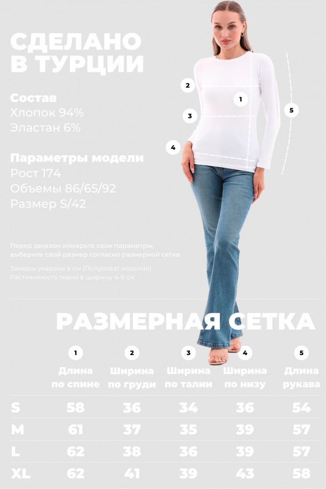 Перед выбором размера, пожалуйста откройте таблицу с размерной сеткой. Для сравнения возьмите ваш старый лонгслив и измерьте с параметрами в таблице. Желаем приятных покупок!