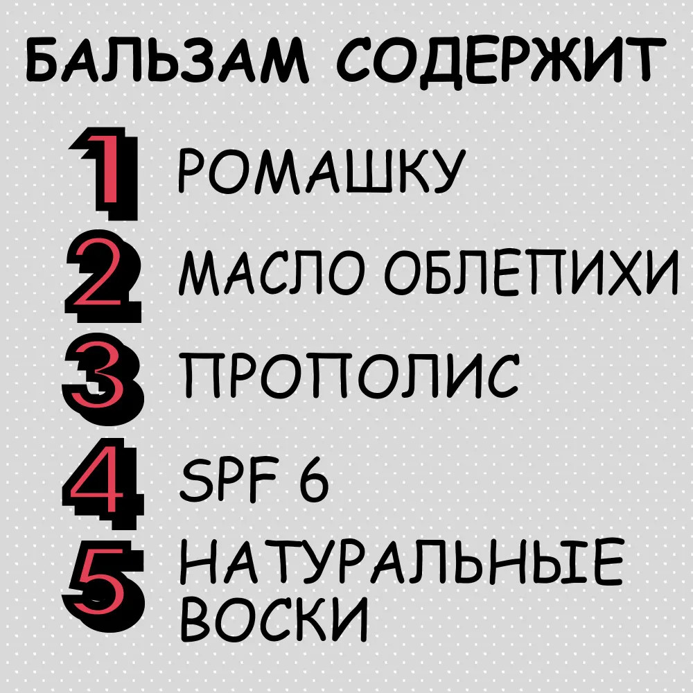 Ricinus communis oil, C12-15 alkyl benzoate, paraffinum liquidum, ceresin, cera alba, olea europaea oil, cera carnauba, dicaprylyl ether, ethylhexyl methoxycinnamate, myristyl lactate, chamomilla recutita extract, hippophae rhamnoides oil, propolis, calendula officinalis extract, salvia officinalis oil, melaleuca alternifolia oil, BHA, tocopheryl acetate, phenoxyethanol, ethylhexylglycerin.